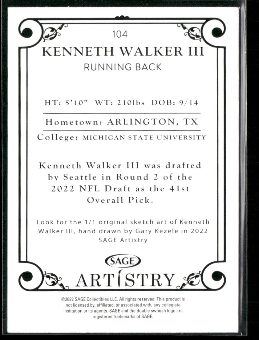2022 SAGE Artistry Silver Football Card RC Kenneth Walker III Rookie Seattle