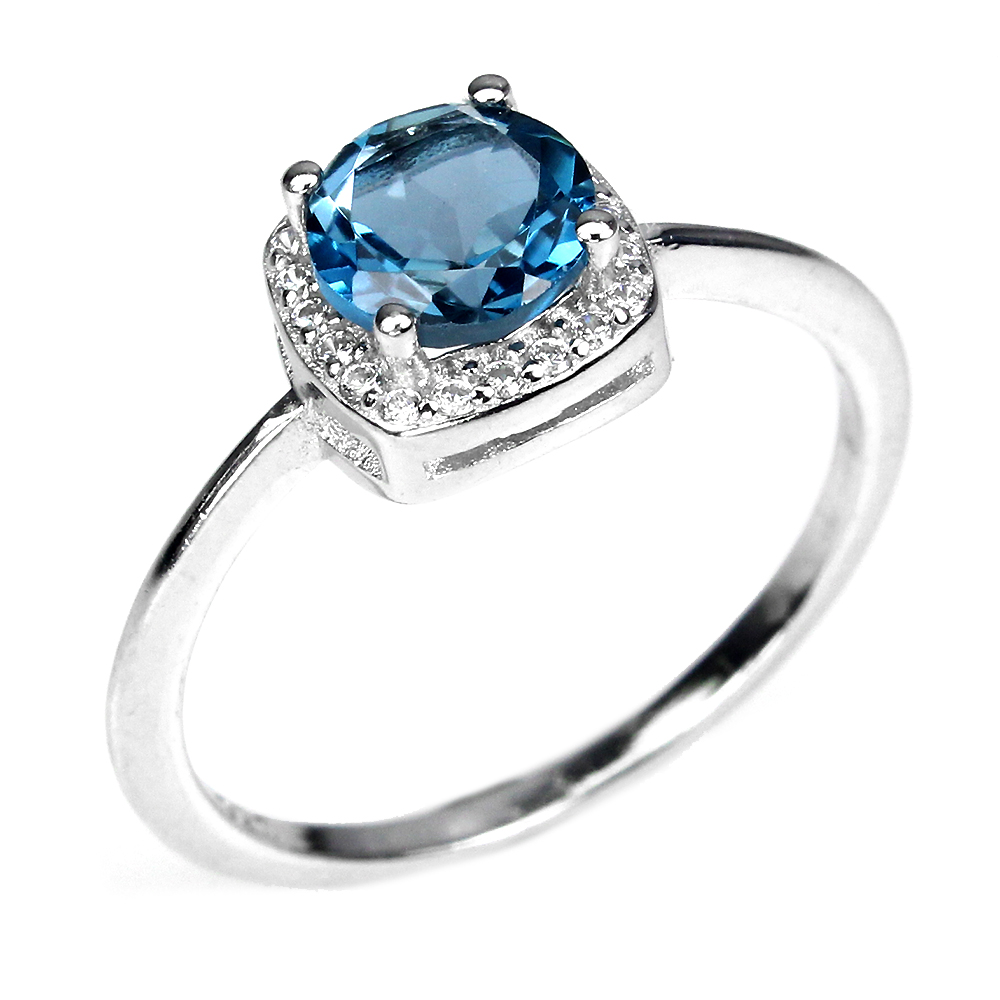 Round London Blue Topaz 6mm Cz White Gold Plate 925 Sterling Silver Ring Size 8