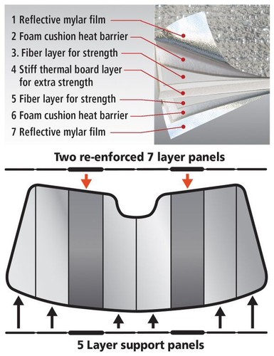 Custom PremiumTM Folding Auto Shade’s unique features: • Two 7-layer re-enforced panels to keep the sun shade up-right at any time. • Multi-layered construction reduces the inside temperature by as much as 40 degrees Fahrenheit. • Protects interior from heat and UV damage, keeps steering wheel and shift knob comfortable to the touch. • Available in over 2,800 custom patterns, for cars, pickup trucks, sport-utility vehicles, minivans and vans. • Finished with a non-abrasive velour binding. • Lifetime warranty.