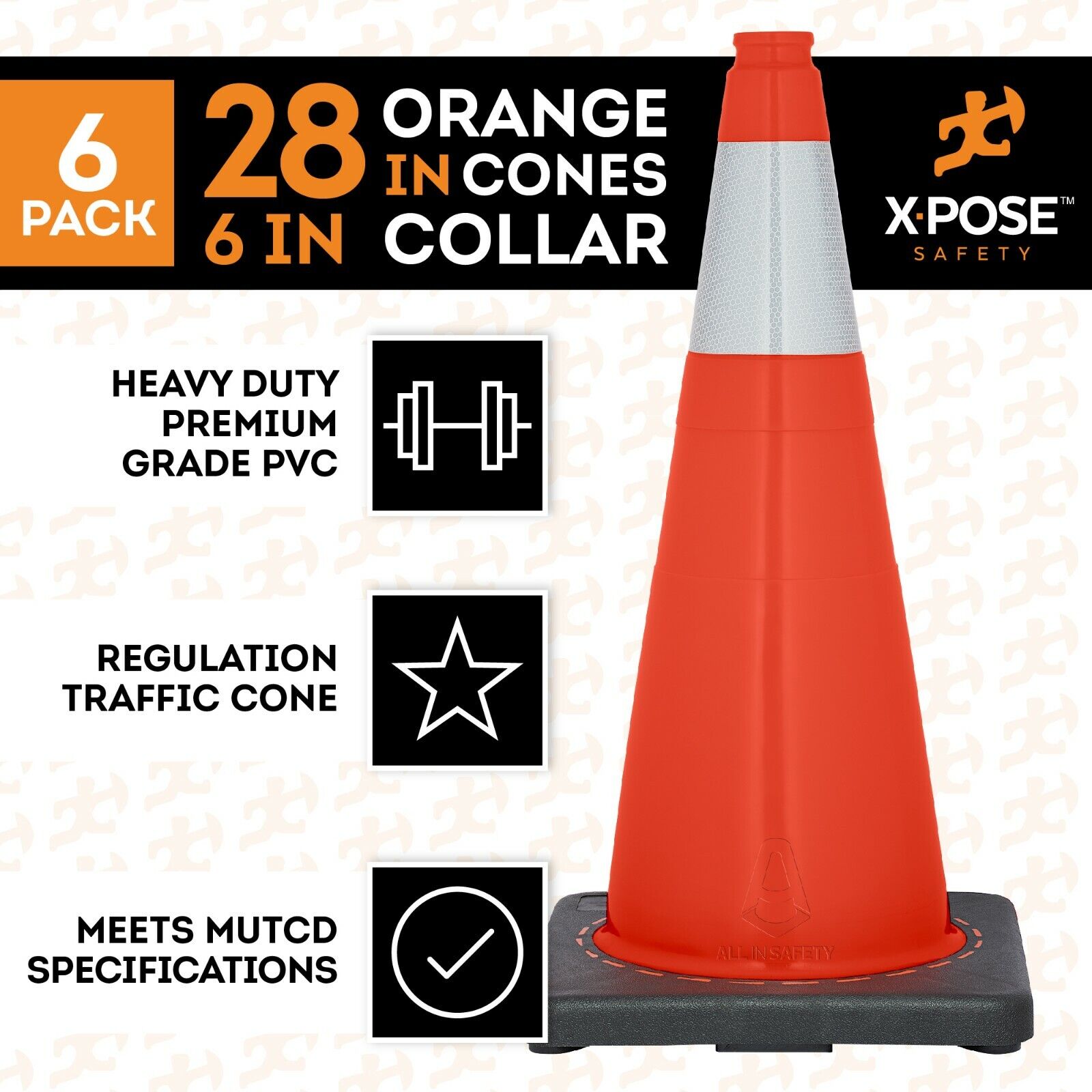 Safety and protection is at the forefront with the Orange Traffic Cones from Xpose Safety. These versatile cones are made from a premium grade PVC that makes them super durable. Each cone effortlessly withstands wind, rain and rocky terrain. You can rely on them not to fall down and a flexible material won't break or crack even after being run over by car tires. Fluorescent orange color means you can't miss them. Warn people, children and drivers of danger or keep everyone in line. Our safety cones are helpful for a number of reasons and they definitely come in handy!