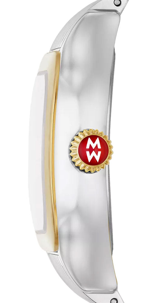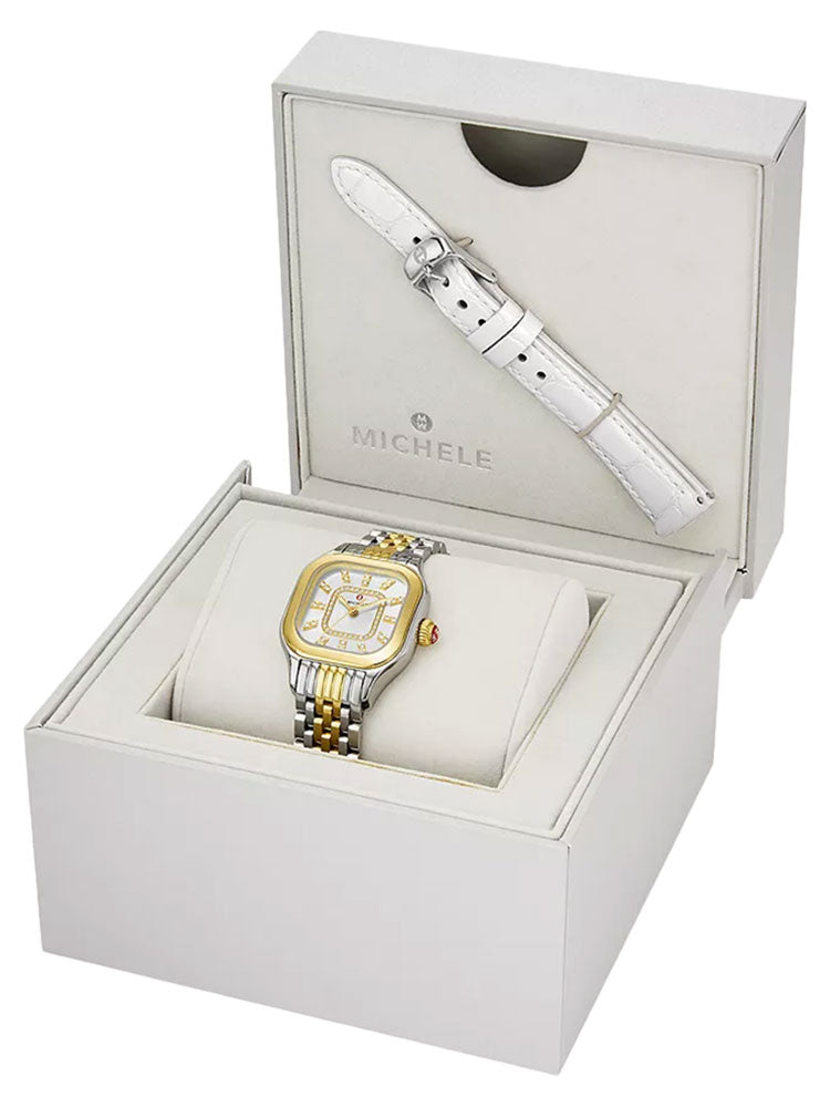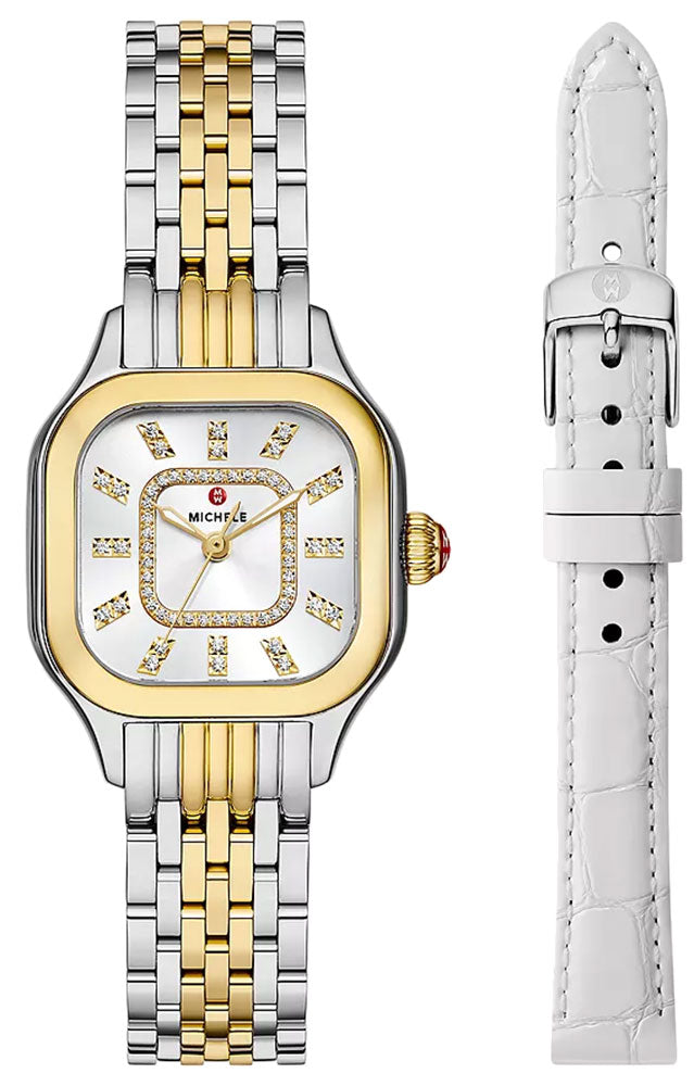 This gift set includes a Meggie watch crafted from polished stainless steel with 18K yellow gold plating along with an interchangeable white glossy genuine leather strap. The silver-tone dial sparkles with 60 hand-set diamonds (0.19 carat weight) with a diamond inner ring and double diamond indexes. The hand indicators are gold-tone and luminous. The 29mm square case has a scratch-resistant sapphire crystal and a crown set with a red enamel Michele logo. This watch runs on a Swiss quartz movement and is water resistant to 50 meters/165 feet.