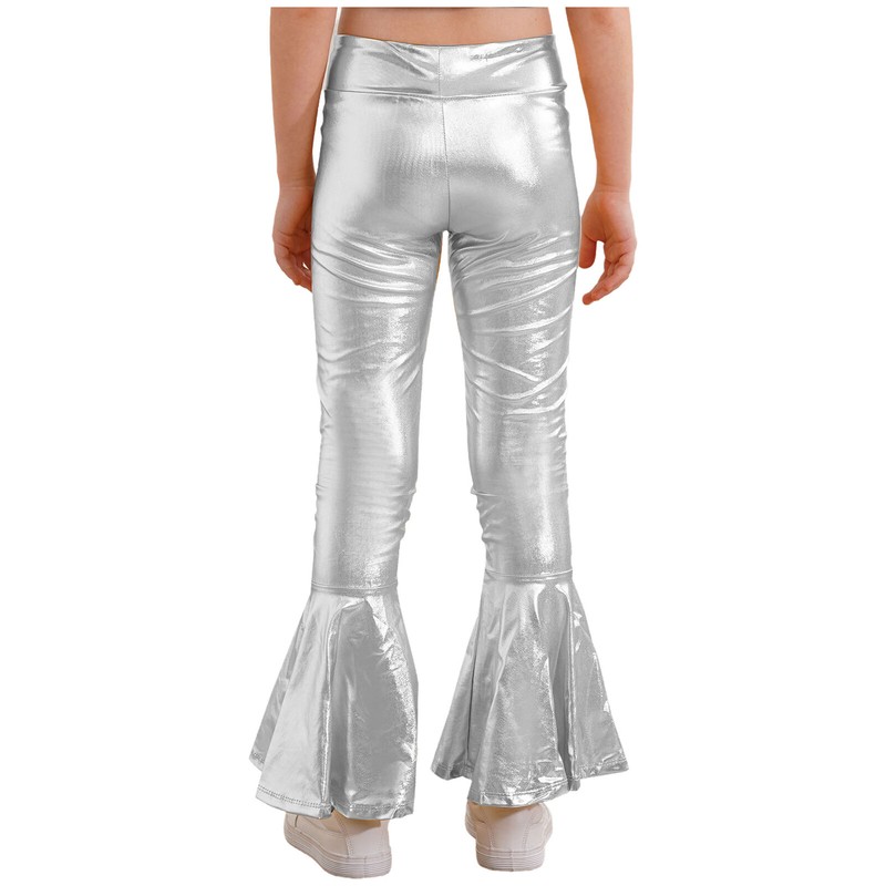 The metallic pants with elastic waistband and high waist, ruffle hem, fashion bell-bottom style.