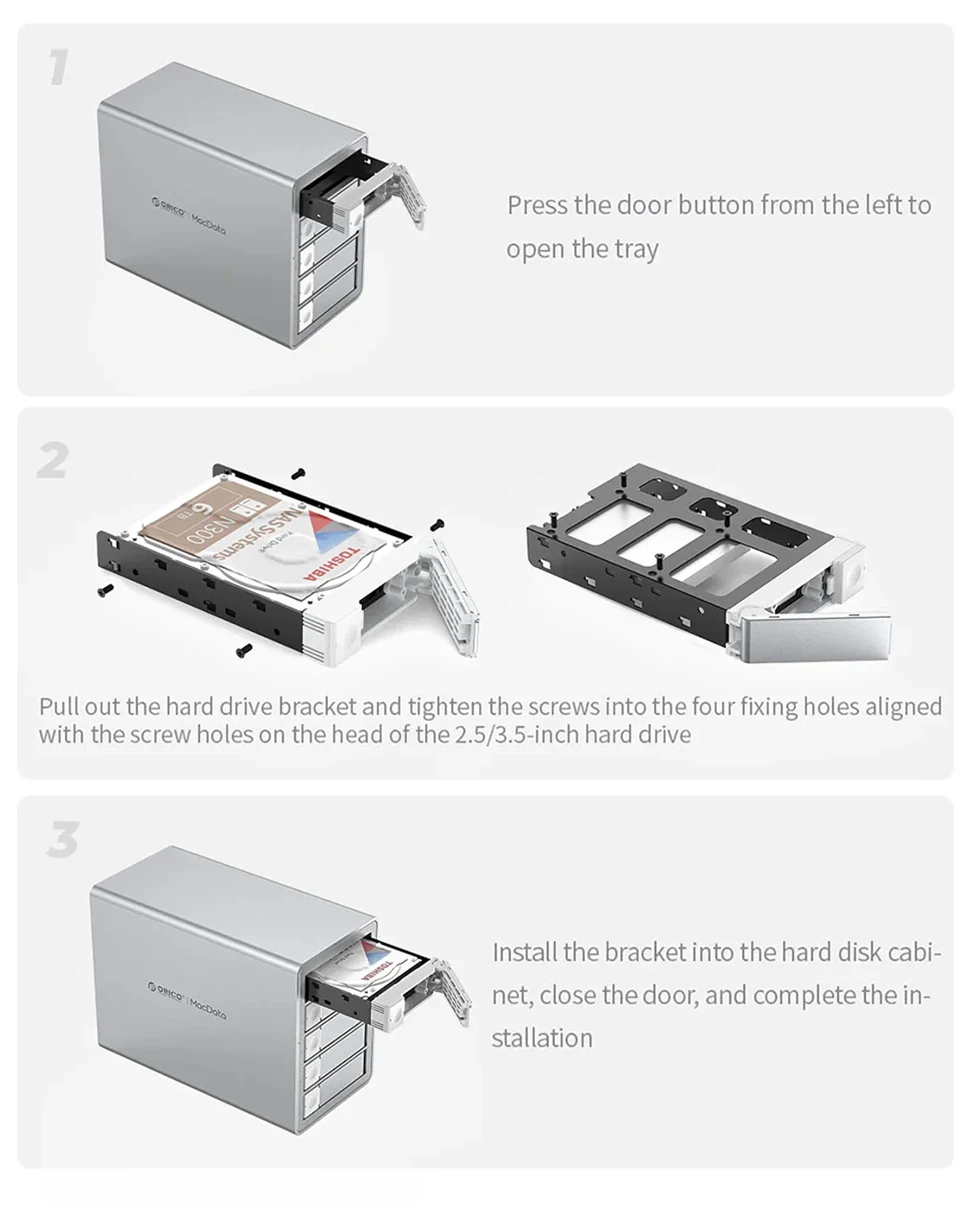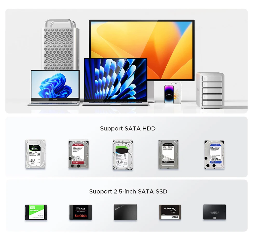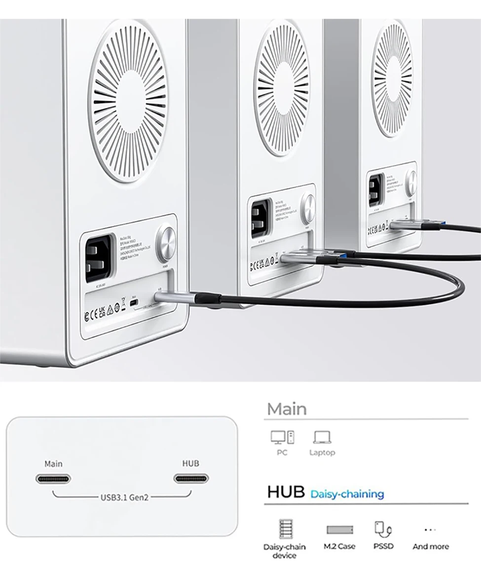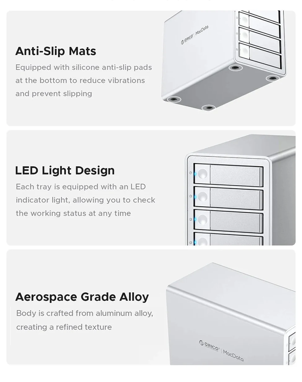 🖴 ORICO Multi-Bay HDD/SSD Docking StationProfessional Storage Expansion with 10Gbps USB 3.2 Gen2 Type-C Why Choose This Docking Station?Enterprise-level storage solution supporting up to 110TB capacity with hot-swap capability and daisy chain expansion. Perfect for content creators, photographers, video editors, and data professionals who need reliable high-speed storage access. ✨ Key Features⚡ Ultra-Fast 10Gbps SpeedUSB 3.2 Gen2 Type-C interface delivers blazing transfer speeds up to 10Gbps for efficient data workflows 🔗 Daisy Chain ExpansionConnect up to 3 devices for massive 330TB total storage capacity - modular data management made easy 🔄 Hot-Swap ReadyIndependent disk slots with eject function - swap drives without interrupting other slots or rebooting ❄️ Superior Cooling SystemAluminum alloy construction with 80mm cooling fan and front/rear airflow design for stable operation 📊 Technical Specifications