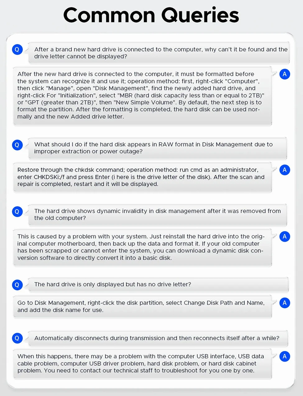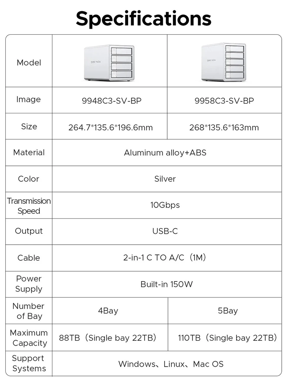🎯 Perfect ForContent Creators: Video editors managing large 4K/8K footage libraries ![]() ![]() ![]() ![]() ![]() ![]() ![]() ![]() ![]() ![]() ![]() ![]() ![]() ![]() ![]() ![]() ![]() ![]() ❓ Frequently Asked QuestionsQ: Is this a NAS (Network Attached Storage)?A: No, this is a DAS (Direct Attached Storage) device. It connects directly to your computer via USB Type-C and does not have a LAN/network port. It functions as external drives connected to your system. Q: Can I replace individual drives without affecting others?A: Yes! Each bay operates independently with hot-swap capability. You can eject and replace drives in any slot without interrupting other drives or rebooting your computer. Q: What's the difference between 4-bay and 5-bay models?A: The 4-bay supports up to 88TB total capacity (4 × 22TB drives), while the 5-bay supports up to 110TB (5 × 22TB drives). Both offer the same 10Gbps speed and features. Q: Does it require drivers or special software?A: No drivers needed! It's completely plug-and-play on Windows, Mac OS, and Linux. The drives will appear as individual volumes on your system immediately after connection. Q: How does the daisy chain expansion work?A: You can connect up to 3 units together using USB Type-C cables, giving you up to 15 drive bays (5+5+5) for a maximum 330TB capacity managed from a single computer connection. Q: Can I disable the auto-sleep feature?A: Yes, the 10-minute auto-sleep can be adjusted or disabled using firmware updates or third-party disk management software compatible with your operating system. Q: Which power plug version should I choose?A: Select the plug type that matches your region: EU (Europe), US (North America), UK (United Kingdom), AU (Australia), or KR (South Korea). All versions deliver the same 150W power. |