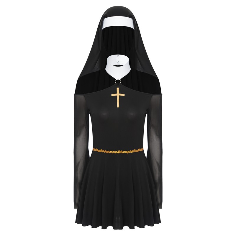 The mesh long-sleeve details give an edgy and mysterious vibe. Gold cross patchwork at the chest is a clear element of nun.