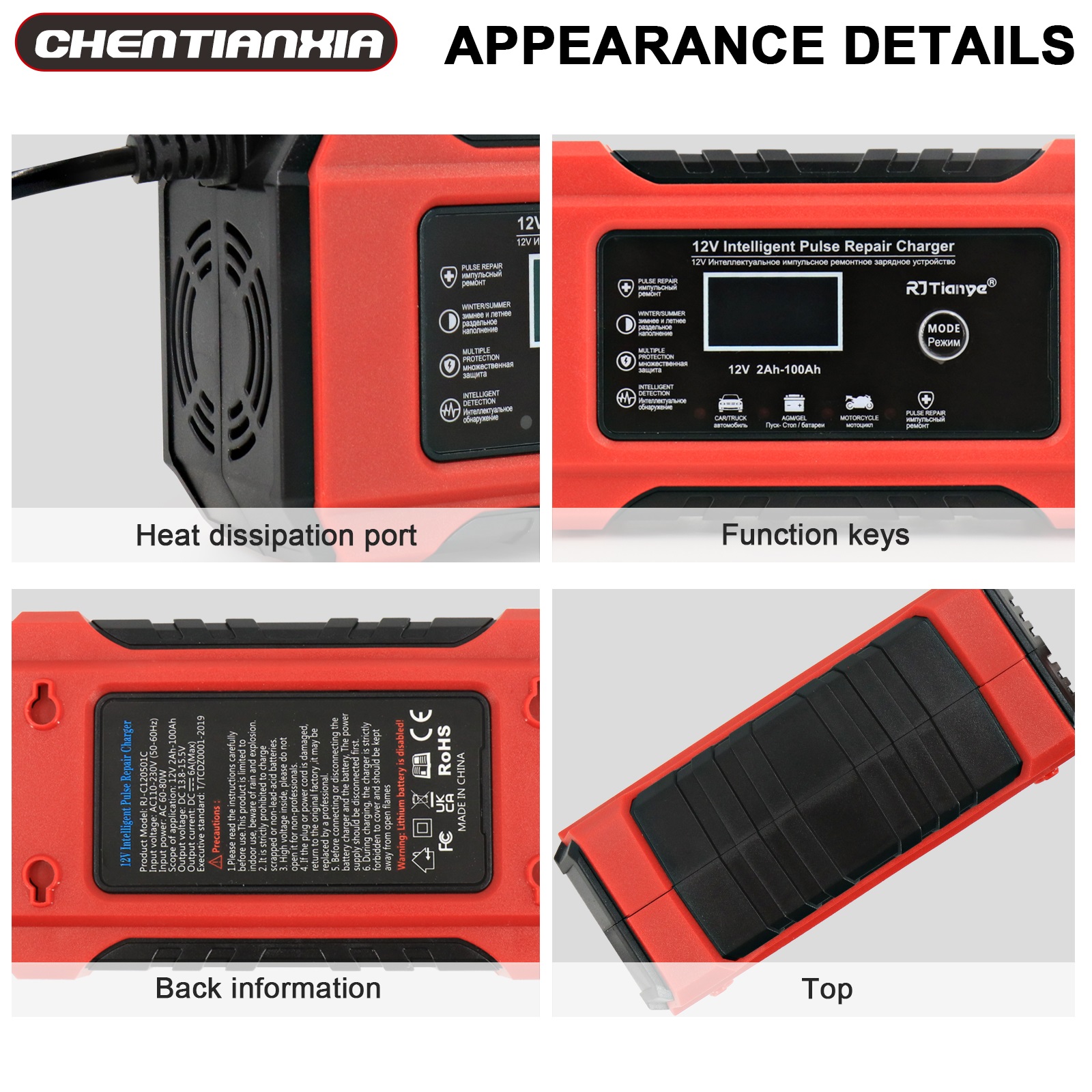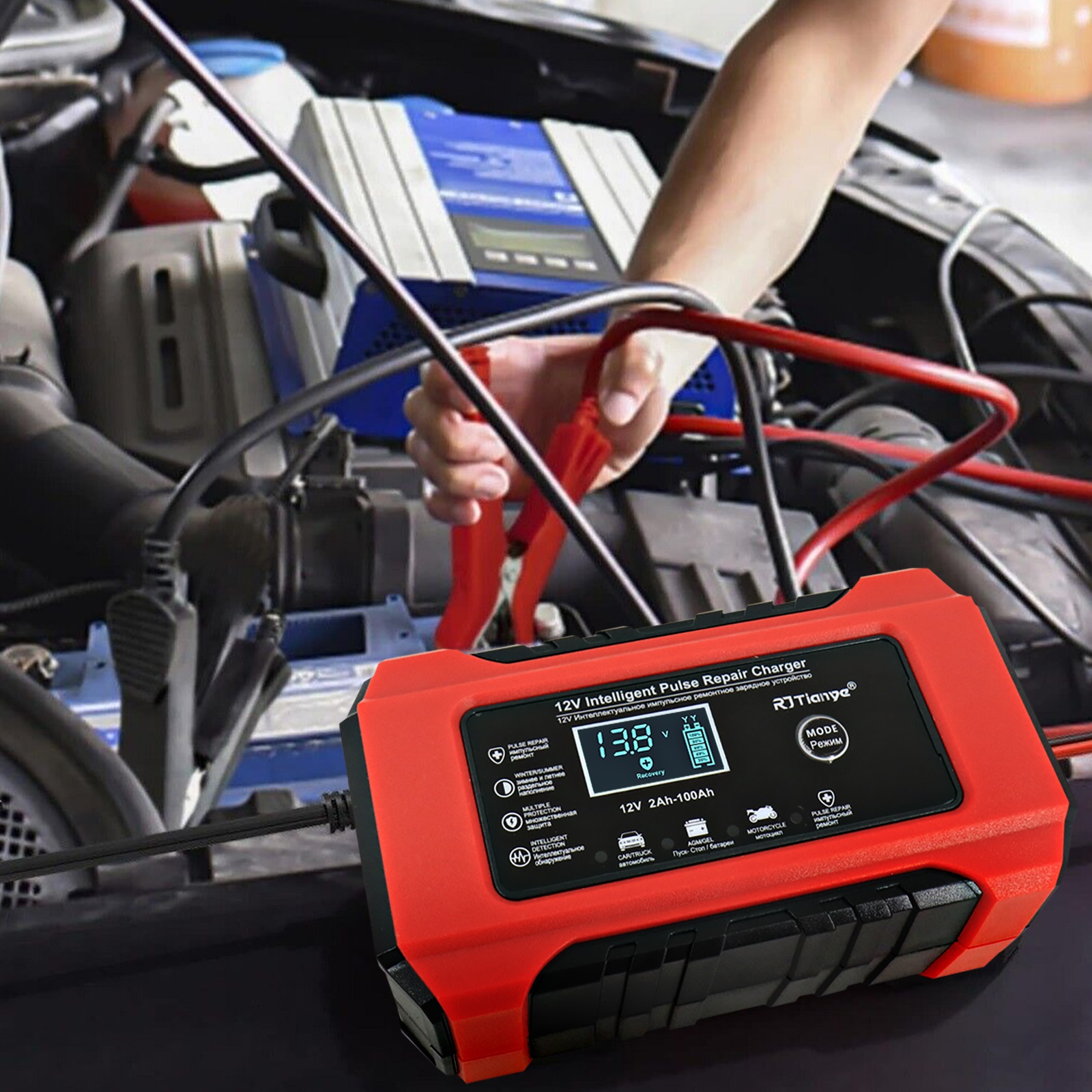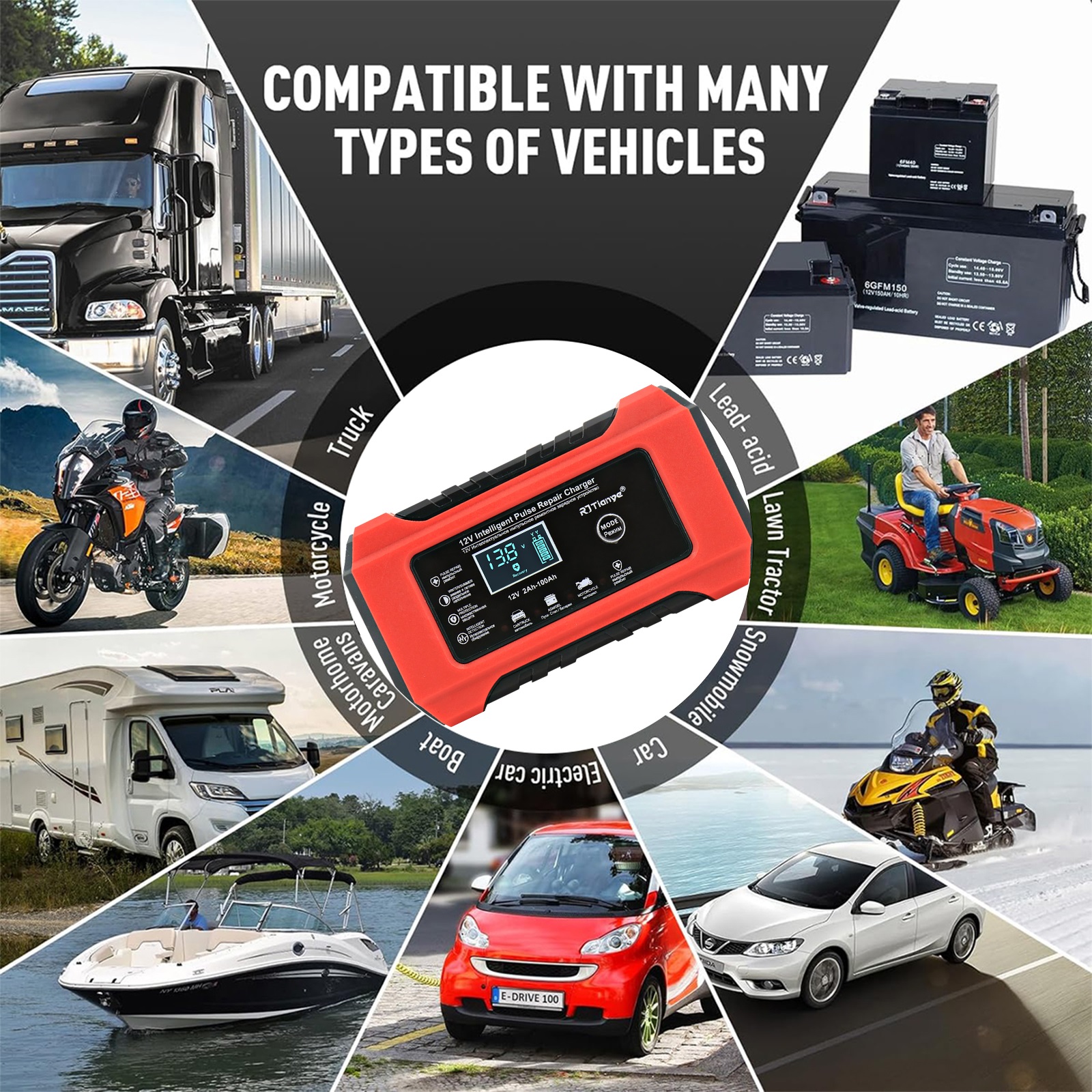 Specification: - 3 Stage Charging Car battery charger fully automatic high-frequency charging delivers 3 stage charging, automatically switching from fast charge, to top-off, then to trickle charge. - 4 working modes (Mode selection, can only be used when the battery and 230V are connected at the same time) 1. 'Car' mode.Suitable for ordinary cars, various agricultural vehicles, trucks and various 12V lead-acid batteries. 2. 'Start-Stop' mode.Suitable for batteries with start-stop function and GEL/AGM/Wet batteries... 3. 'Motorcycle' mode.Suitable for various motorcycles, and various 12V lead-acid batteries. It will enter trickle charge mode (floating charge) to maintain the voltage of the battery and keep the battery charged for a long time. Even if the screen shows OFF, it will monitor the voltage of the battery. Once the voltage drops below 12.5 volts, the charger will automatically turn on and charge it again to keep the voltage normal. 4. 'Repair' mode.If it has been idle for a long time, is old, and cannot be charged, you can choose the "Repair" mode to try to activate the battery.