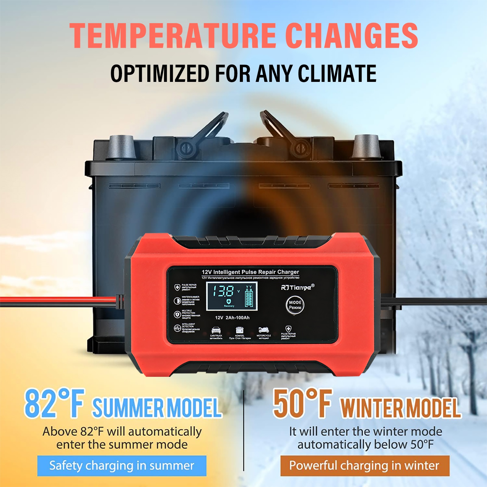 Note: - This charger please for indoor,beware of rain. - This charger is for battery capacity between 2AH to 100AH. - Please check the capacity (AH) of your battery before buying the charger! Thanks! - Do not be carried with the vehicle,prevent shock.