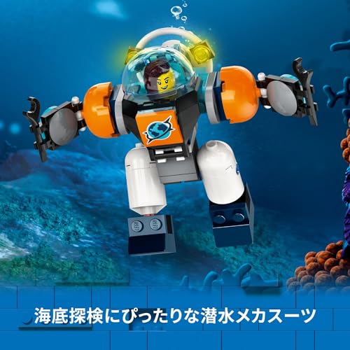 The LEGO(R) City Deep Sea Exploration Vessel (60379) is a playset packed with realistic gimmicks, including a spherical cockpit, science lab, deep sea exploration drone, and submersible mech suit. In addition, the shark lair shipwreck, giant jellyfish, treasure chest, and 6 minifigures expand the creative possibilities endlessly.