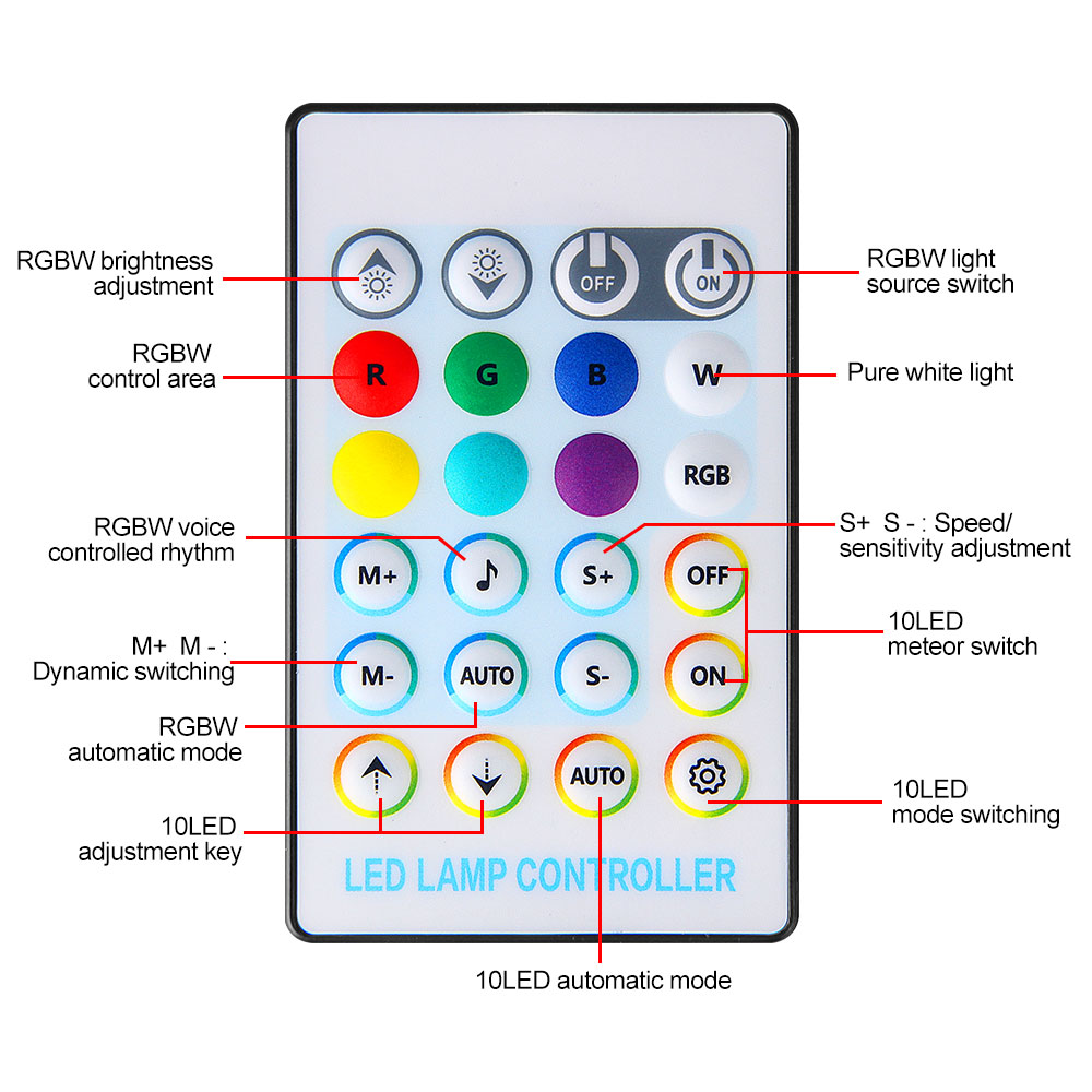 8 static colors (mixed white, pure white, red, green, blue, yellow, ice blue, pink + DIY color), jumping, fading, twinkling with four speeds, brightness and mode speed adjustable.