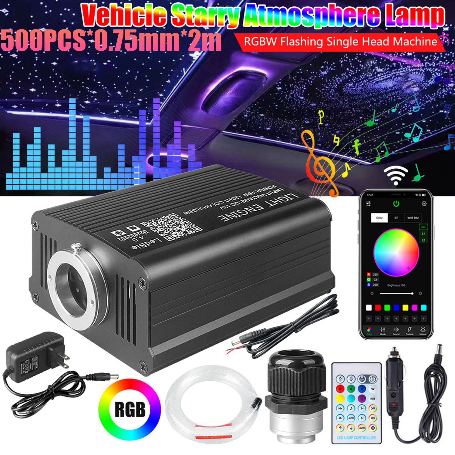 Control the alternator by remote control or app control via Bluetooth connection. App control: more than 16 million static colors, twinkle speed adjustable, 1%-100% sound sensitivity and dimming function adjustment, 20 dynamic modes, etc.