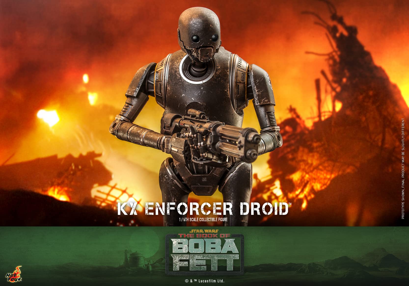 Star Wars, the monumental science fiction movie, is now available in Hot Toys' TV Masterpiece series! From the Disney+ drama Boba Fett, the KX enforcer droid is now available! Boba Fett/The Book of Boba The KX enforcer droid that appears in Fett is three-dimensionalized as a high-end 1/6 figure with a total height of approximately 36 cm and over 30 movable parts. The slender yet large body has been carefully finished down to the finest detail, with attention to texture and detail, such as the mechanical structure of each part and the driving parts of the joints. Painting and weathering are applied using industry-leading technology to recreate the dirt and severe damage caused by battle. The eyes are equipped with an LED light-up function. You can change your line of sight with the eye movement gimmick. As weapons, a blaster rifle and a blaster pistol are included. The hand parts have movable finger joints, so you can create a variety of scenes. The diorama-style pedestal is a special specification modeled on the ground of the planet Mandalore. By displaying it together with the weathered Mandalorian helmet, you can enjoy the world view of the work even more deeply. A KX enforcer droid of the Galactic Empire descends on the planet Mandalore, which has been purged and turned into a sea of fire. This definitive item, which fully captures the charm of Boba Fett/The Book of Boba Fett, is a must-see item that makes you feel the Force! Presented by Hot Toys with pride and love. /6 Star Wars series. Keep an eye on the future lineup!