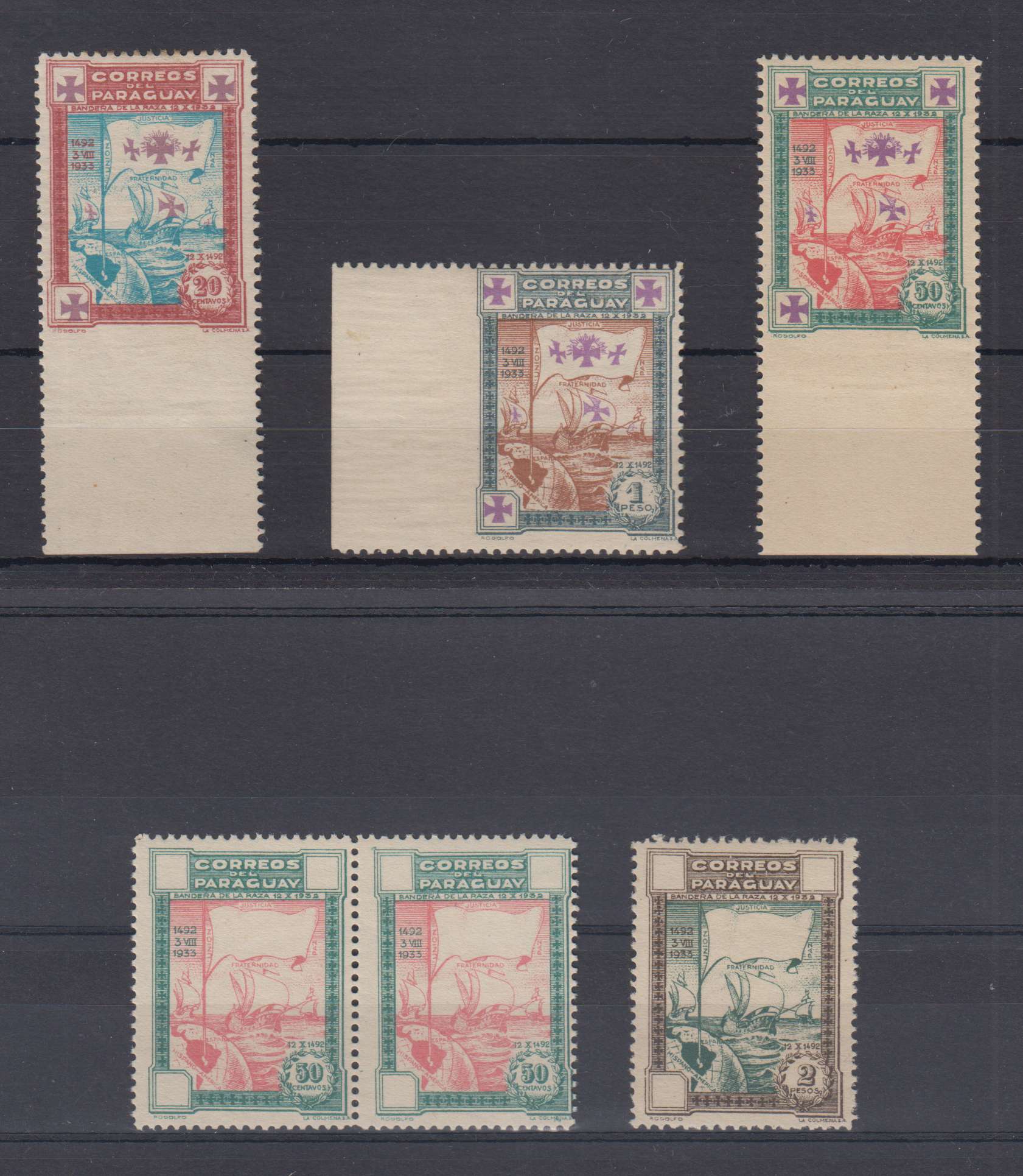 PARAGUAY. 1933. Flag of the race & Columbus. Scott 331-333 & 335. Four singles & a pair. MAJOR VARIETIES with three marginal singles imperf on margin side & pair & single WITHOUT CROSSES, error. Hinged mint. Usual tropicalized gum otherwise FINE, VERY FINE. Eye catching group.-