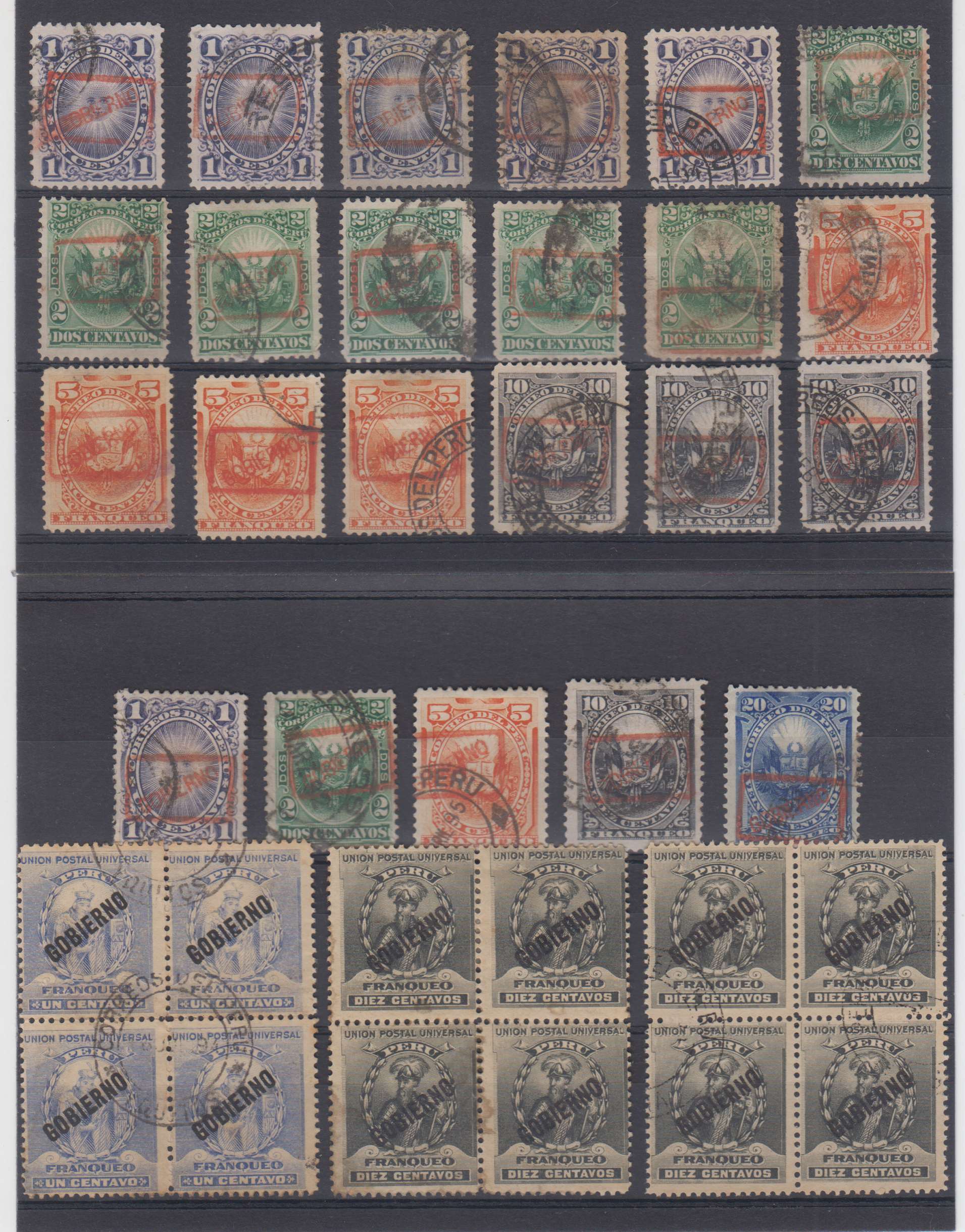 PERU. 1890-1901. OFFICIALS. Scott 02 thru 026 not complete. Group of 97 stamps including full sets. Shades. Hinged mint, unused or used. Mixed quality, AVERAGE to FINE, VERY FINE. SCV $ 199.50+ 140230