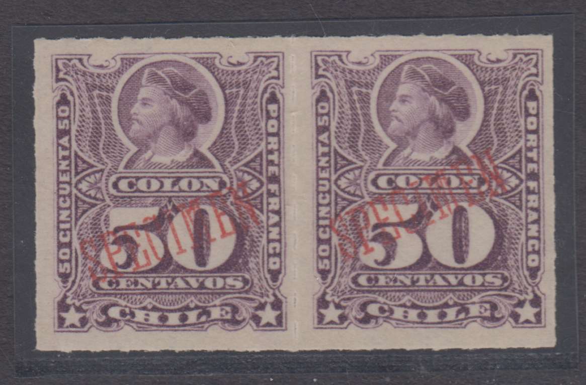 CHILE. 1878-99. Columbus. Scott 34. Lilac. Key value. Pair, each stamp with red "SPECIMEN overprints. Mint never hinged. VERY FINE. Ex ABNCo proof files. Most scarce.- 140629
