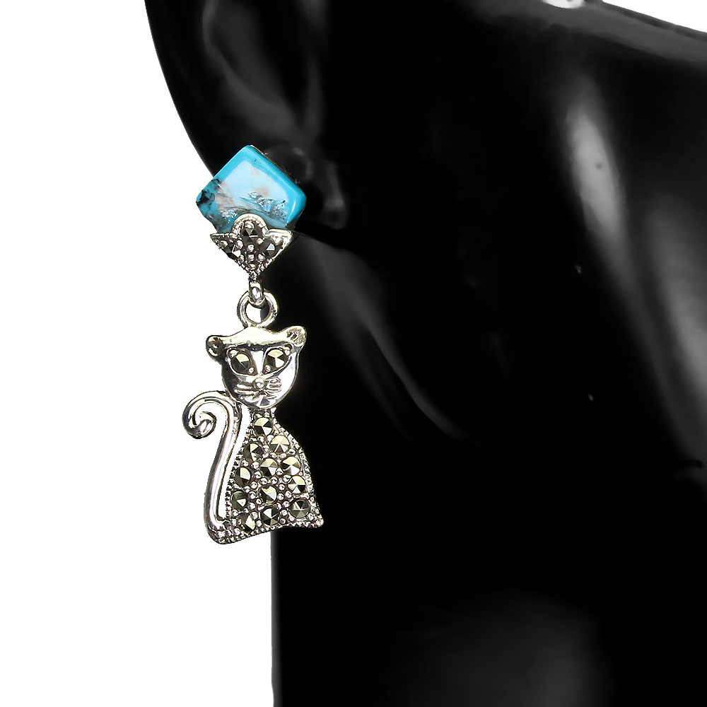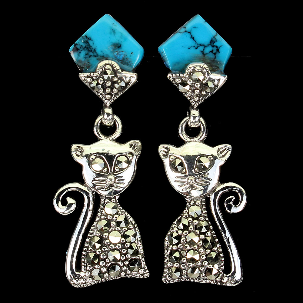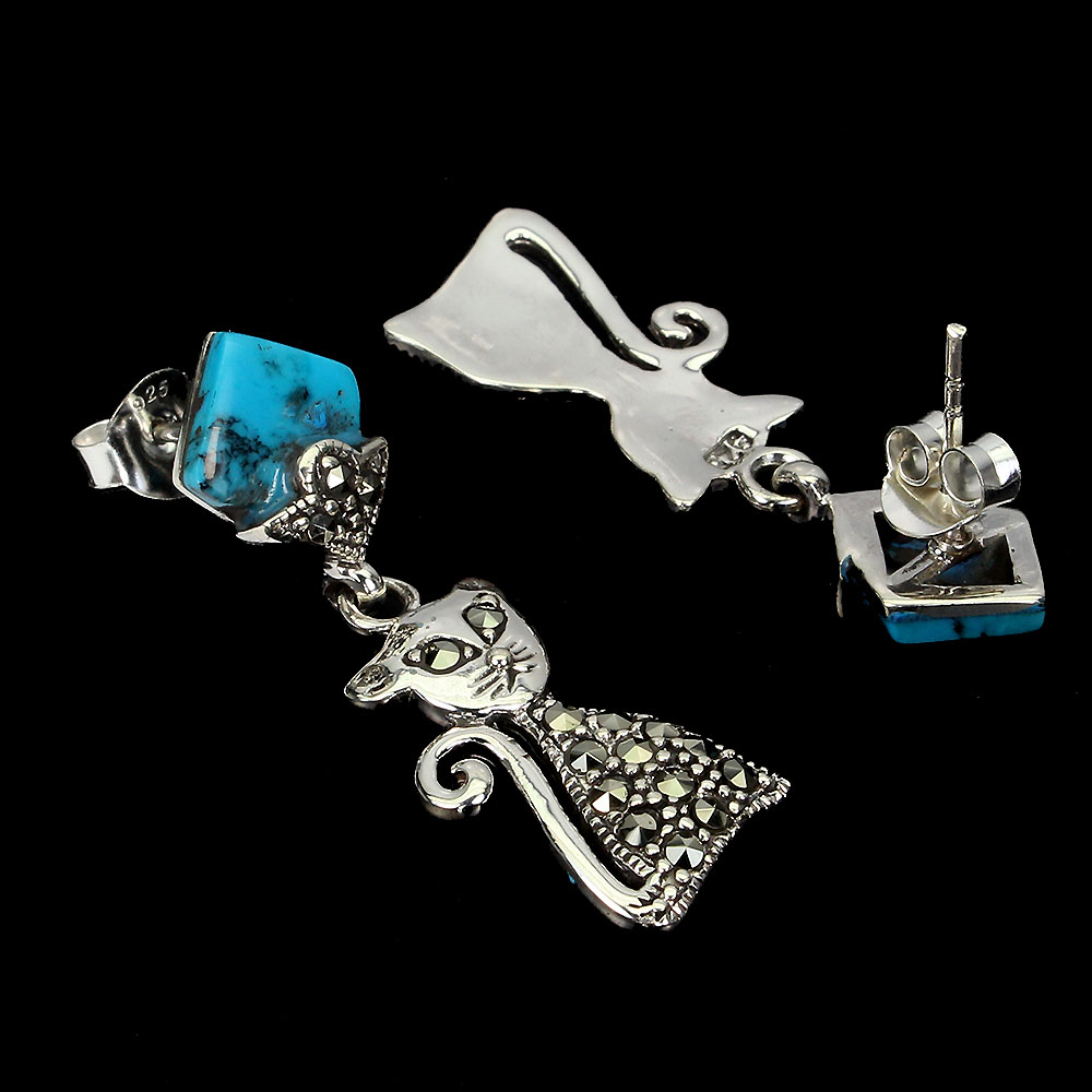 Stabilized Blue Turquoise 10x8mm Marcasite 925 Sterling Silver Cat Earrings