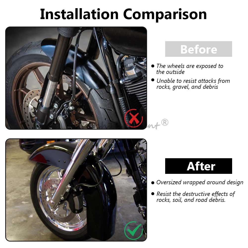 Oversized wrapped around design,effectively prevent muddy & water splashes to the motorcycle body, effectively protect the surface paint of your bike.
