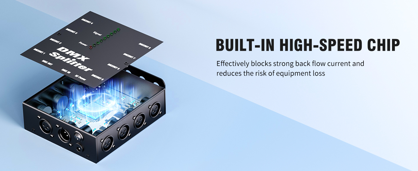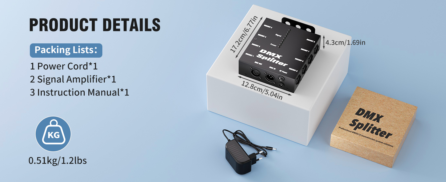 Specifications: Model: ZQ12077 Color: black Material: stainless steel+PCB Input Voltage: AC110V-240V 50/60HZ Input voltage: DC9v 1A DMX signal output branch: 1 direct input/output port, 8 independent DMX signal outputs Protection level: IP20 Working environment: -20℃-40℃ Input/output: 3-core XLR input/output Product Details: Size: 4.3*12.8*17.2cm Net Weigh:0.51kg