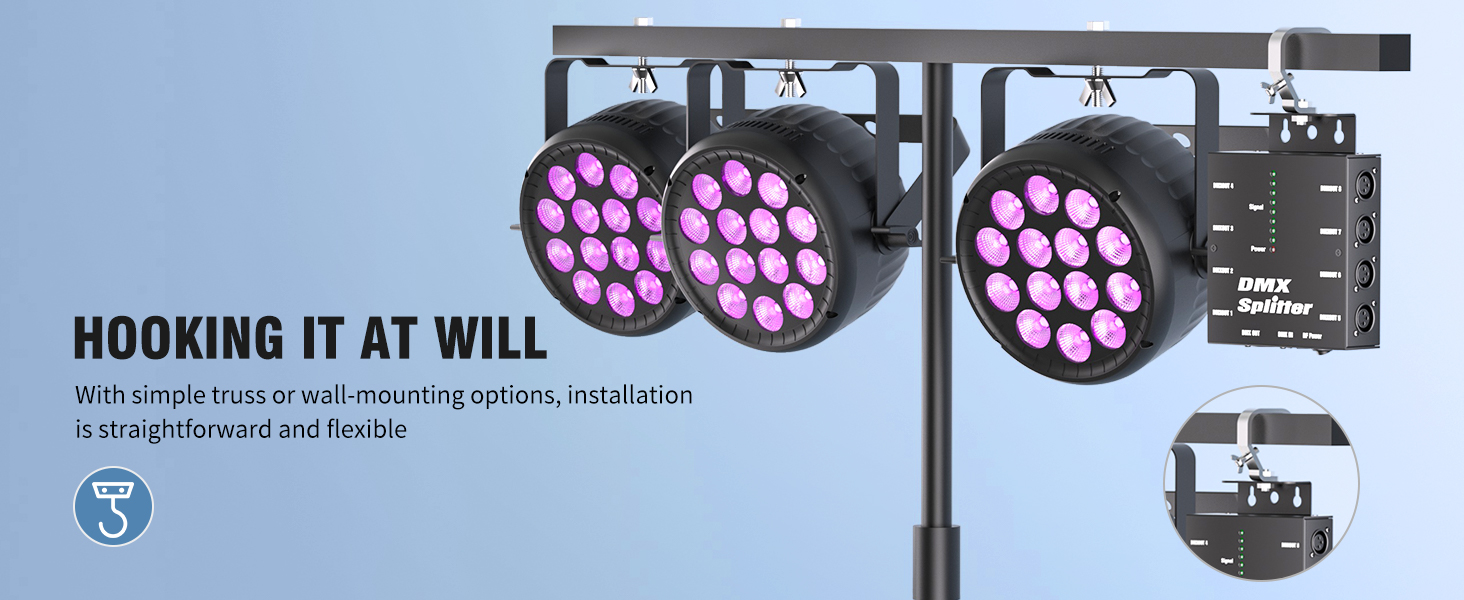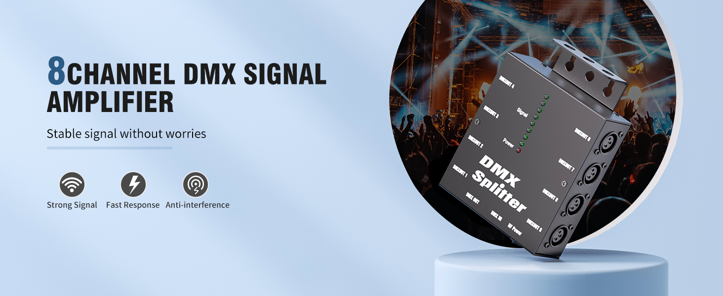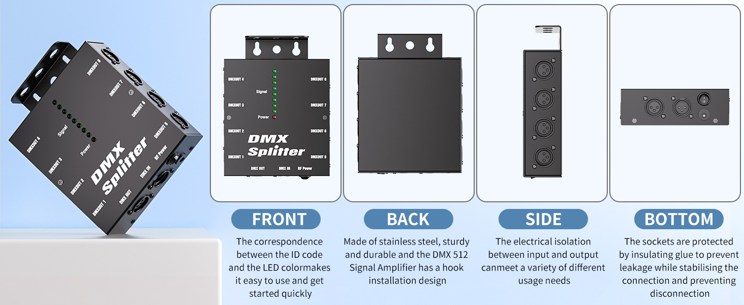 Product Features: 1. Simple and efficient connection. Can be used to send and receive DMX signals wirelessly. Can also be used without wireless, directly connected to the line control. 2. Easy to use. Hook mounting design, with LED indicator, out of the box can be used, very convenient and quick. 3. Stable signal. Each output is electrically and optically isolated from the input and the photoelectric converter between the other outputs to ensure signal stability and reliability. 4. Versatile. It has 1 DMX input, 8 DMX outputs and 1 DMX straight-through terminal, and can control up to 512 channels, which can meet a variety of different usage requirements.