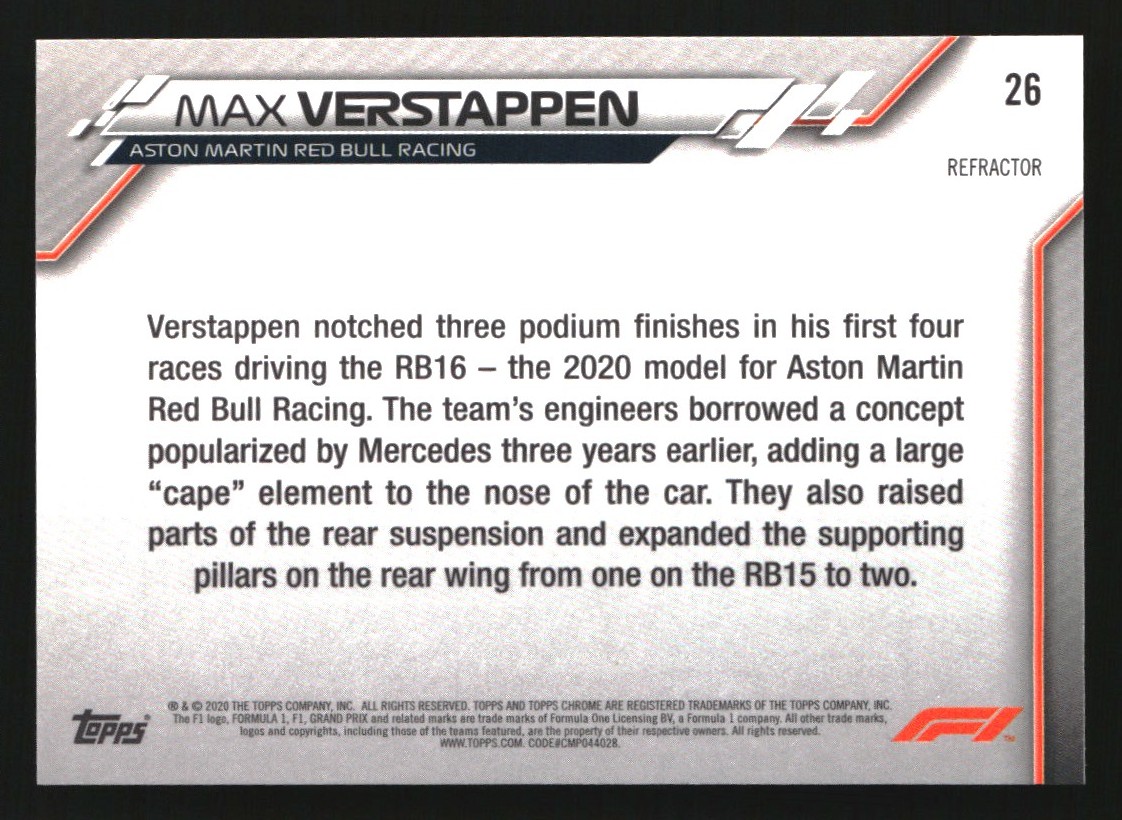 | MAX VERSTAPPEN 2020 TOPPS CHROME FORMULA 1 REFRACTOR #26 ASTON MARTIN RB RACING |
