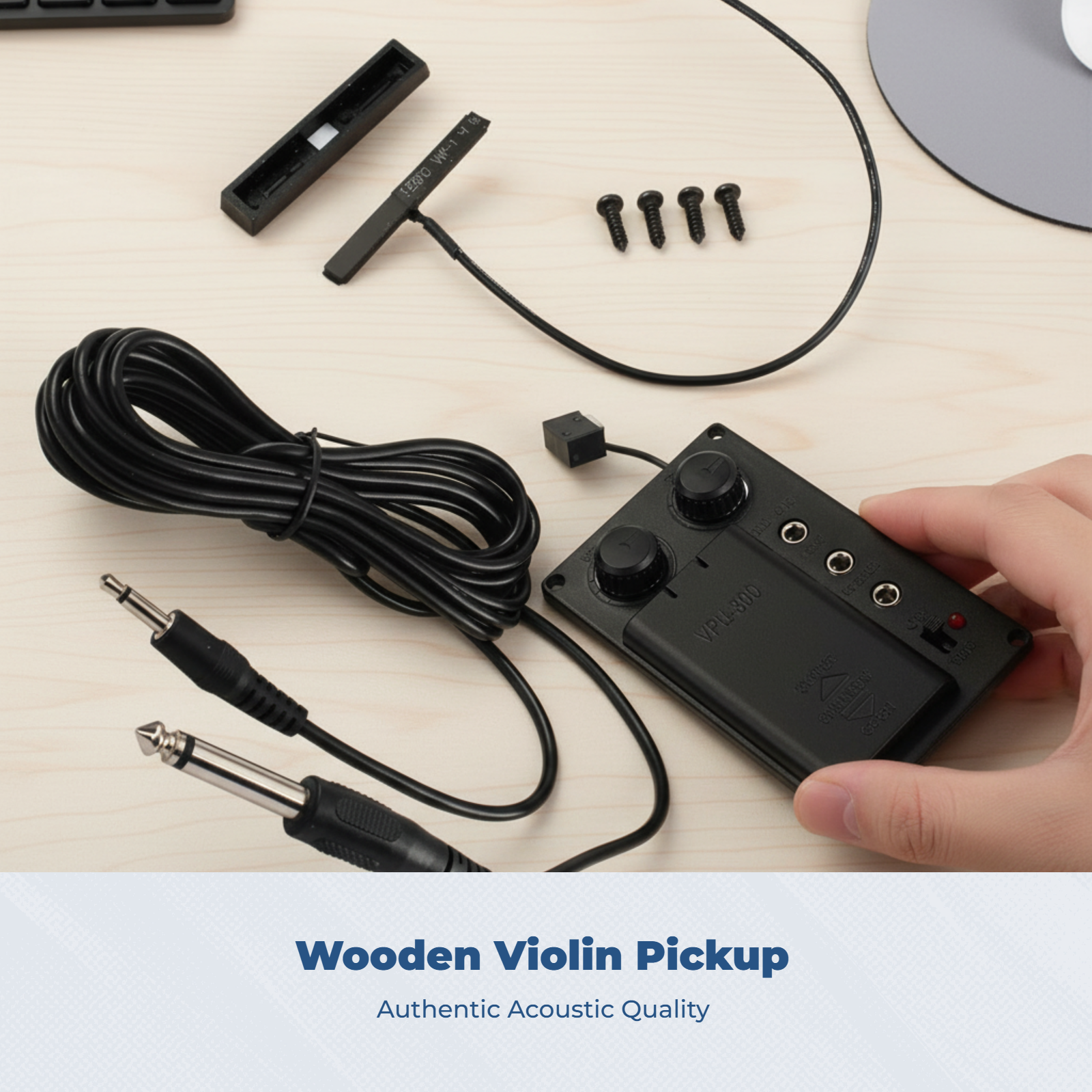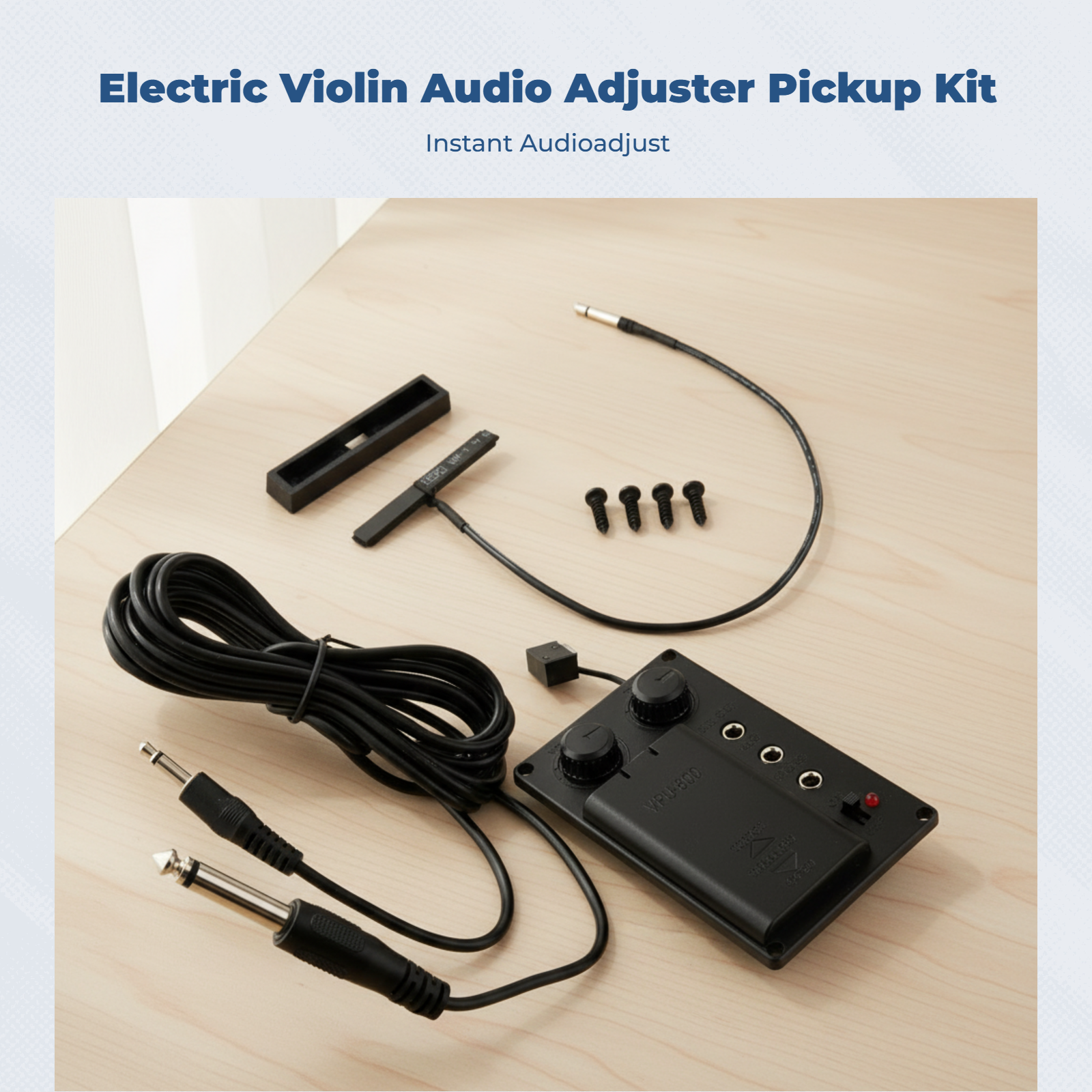 This is a complete electronic violin pickup kit, designed for musicians looking to convert their acoustic violin into an electric instrument or for building a custom silent violin. The system is centered around a sensitive piezo transducer, which is mounted under the bridge to capture the instrument's authentic tonal qualities and vibrations.