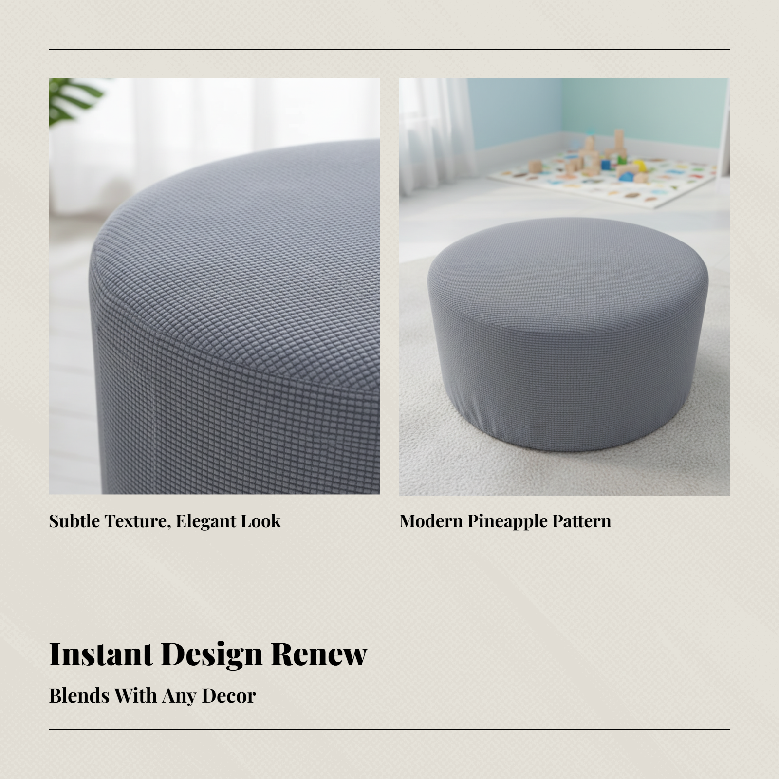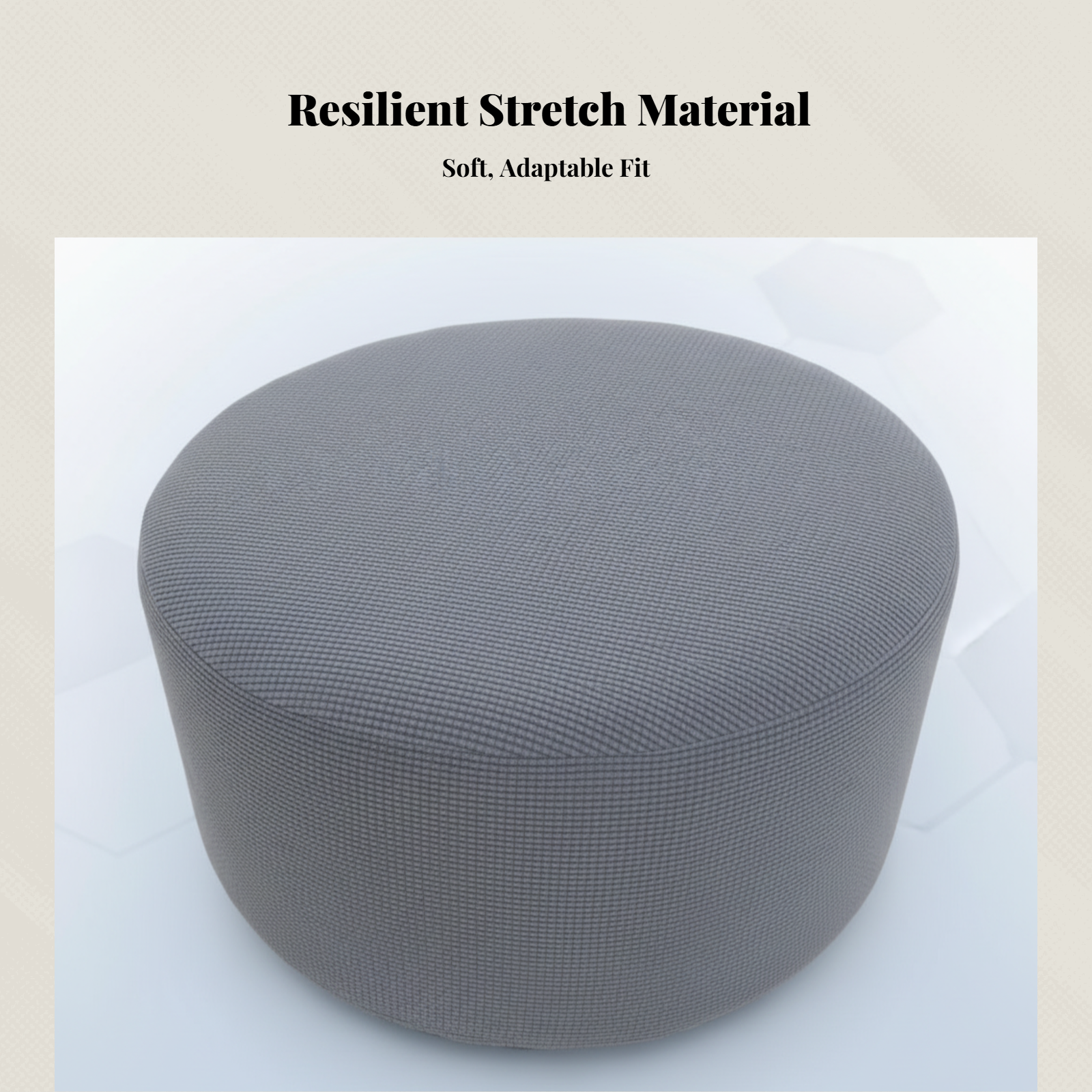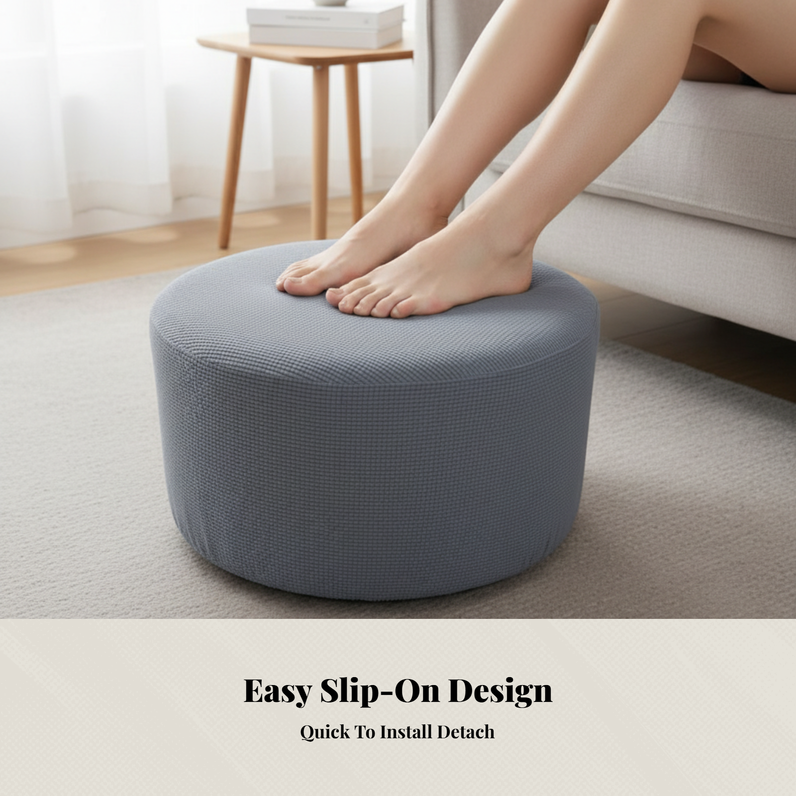 This is a stretchable round ottoman slipcover in a versatile gray color. It is designed to give your footrest a fresh new look while protecting it from daily wear, spills, and stains. The solid gray design easily complements various interior decor styles, making it a practical addition to your bedroom or living room.