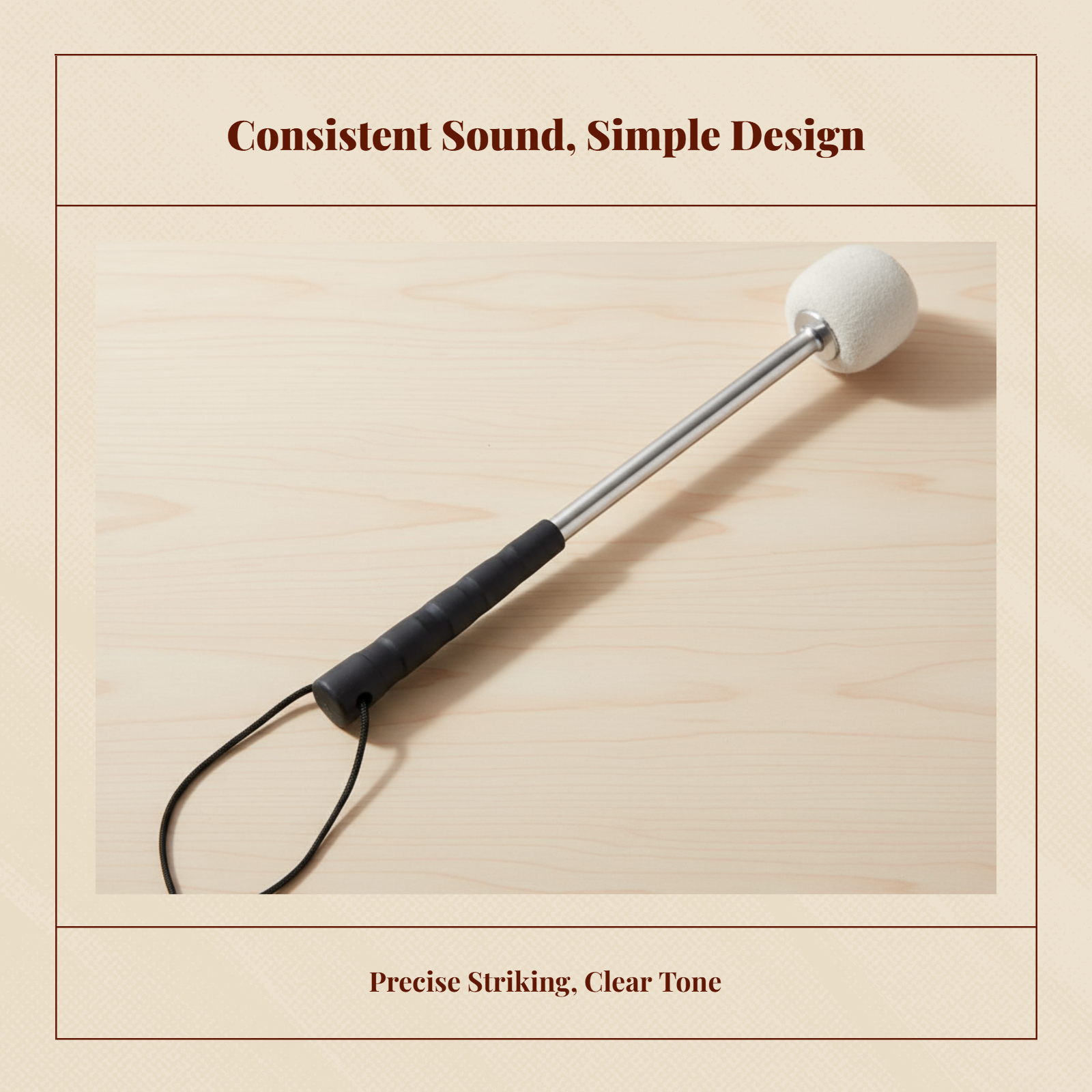 The mallet can be used in school bands, practice sessions, or outdoor performances where a marching tenor drum is required. The wool felt head is suited to producing a clear yet moderated sound, while the alloy body provides a solid feel in hand. The strap can be looped around the wrist to reduce the chance of dropping the mallet while on the move.