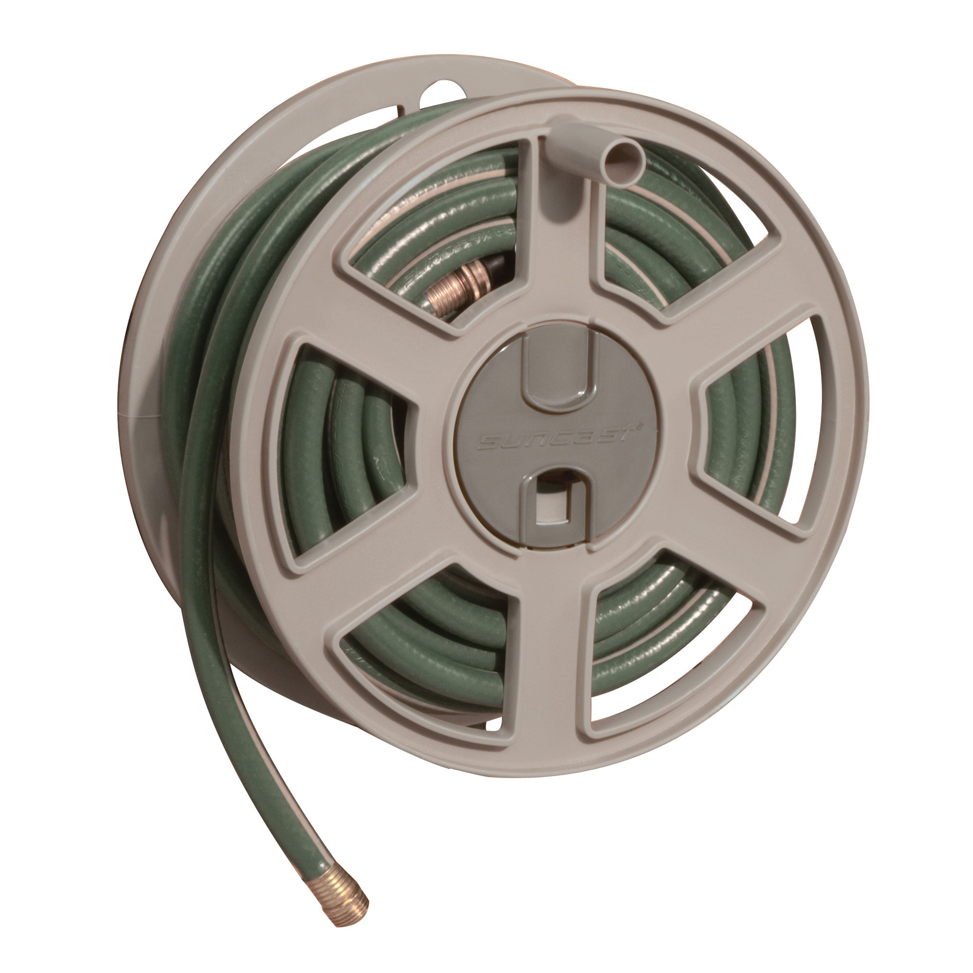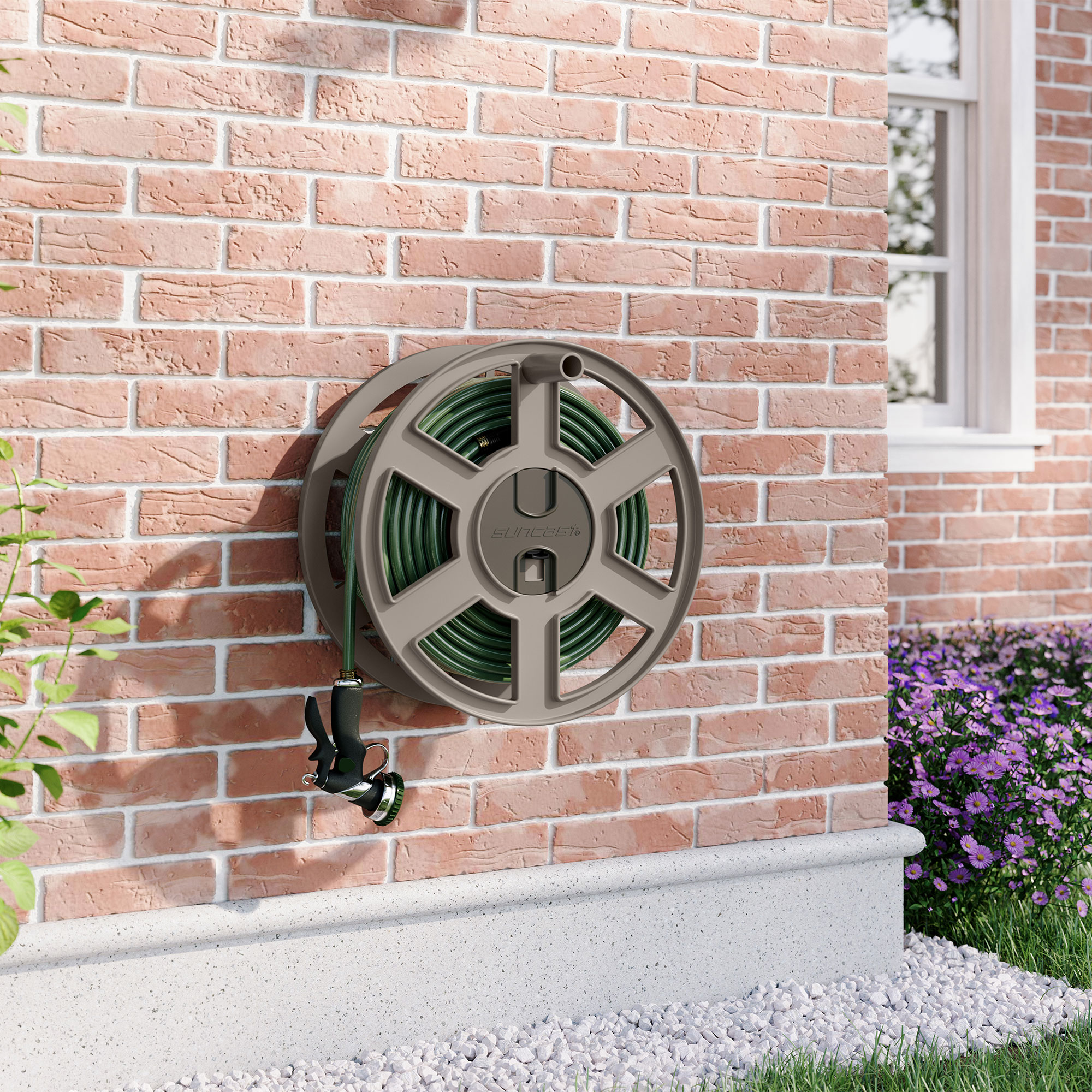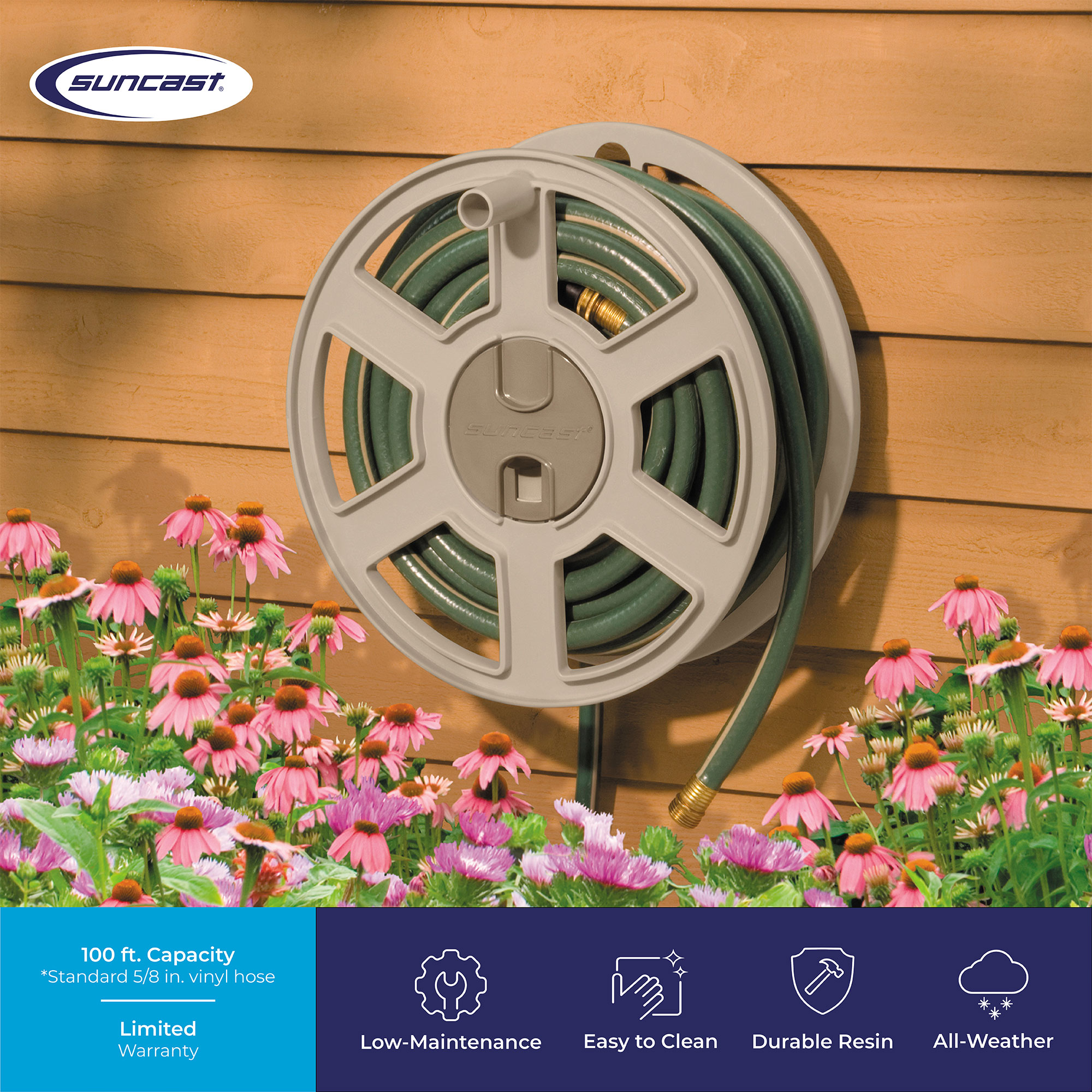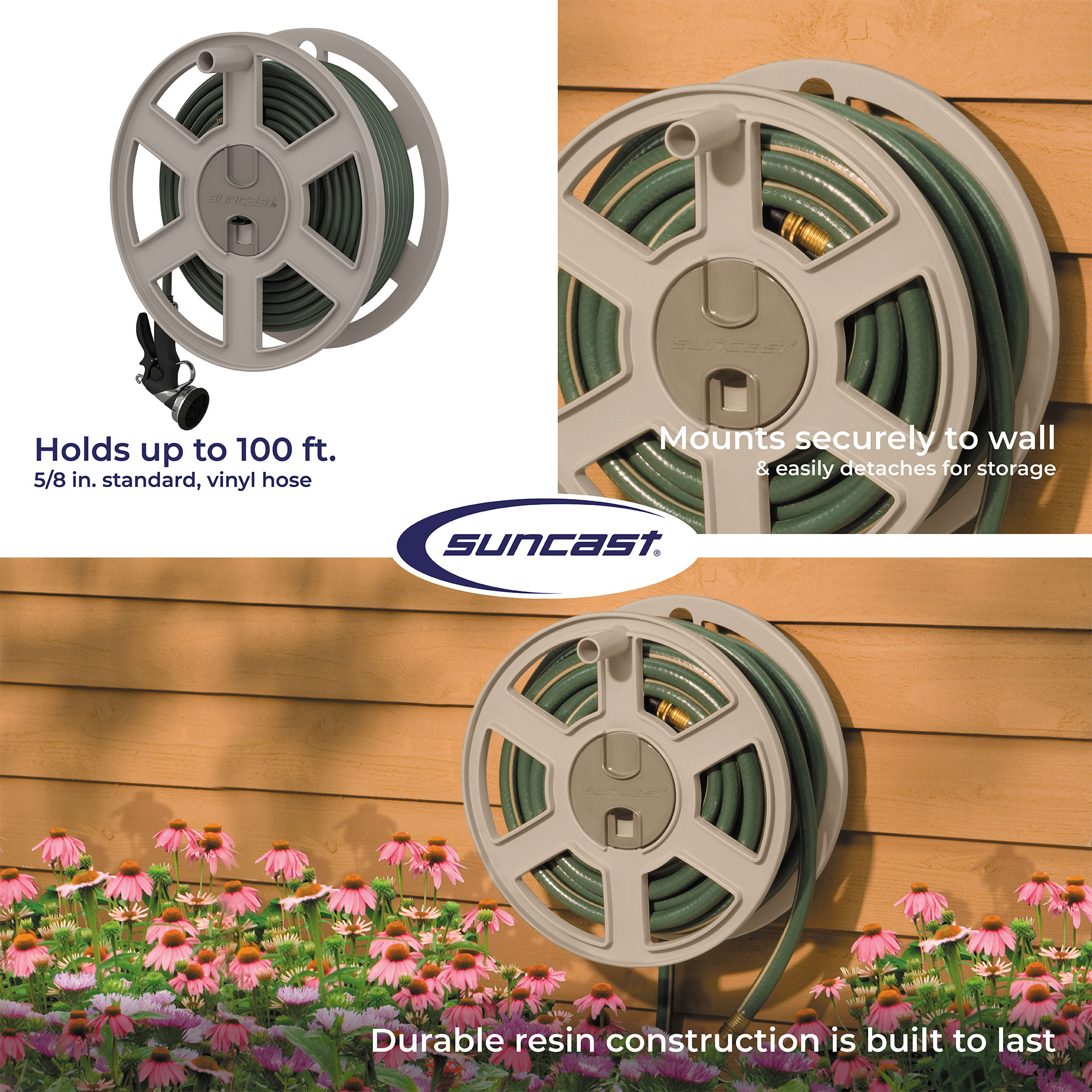 The Suncast Hose Reel is designed to hold your hose year round. The 100-foot Hose Reel mounts securely to a wall and features a removable reel for winter hose storage. This water hose reel has a sturdy resin construction and is equipped with the patented Easylink system that ensures a watertight connection between the hose reel and the hose. The Suncast Hose Reel comes fully assembled and is a smart choice for those who want to keep up to 100' of hose neat and organized.