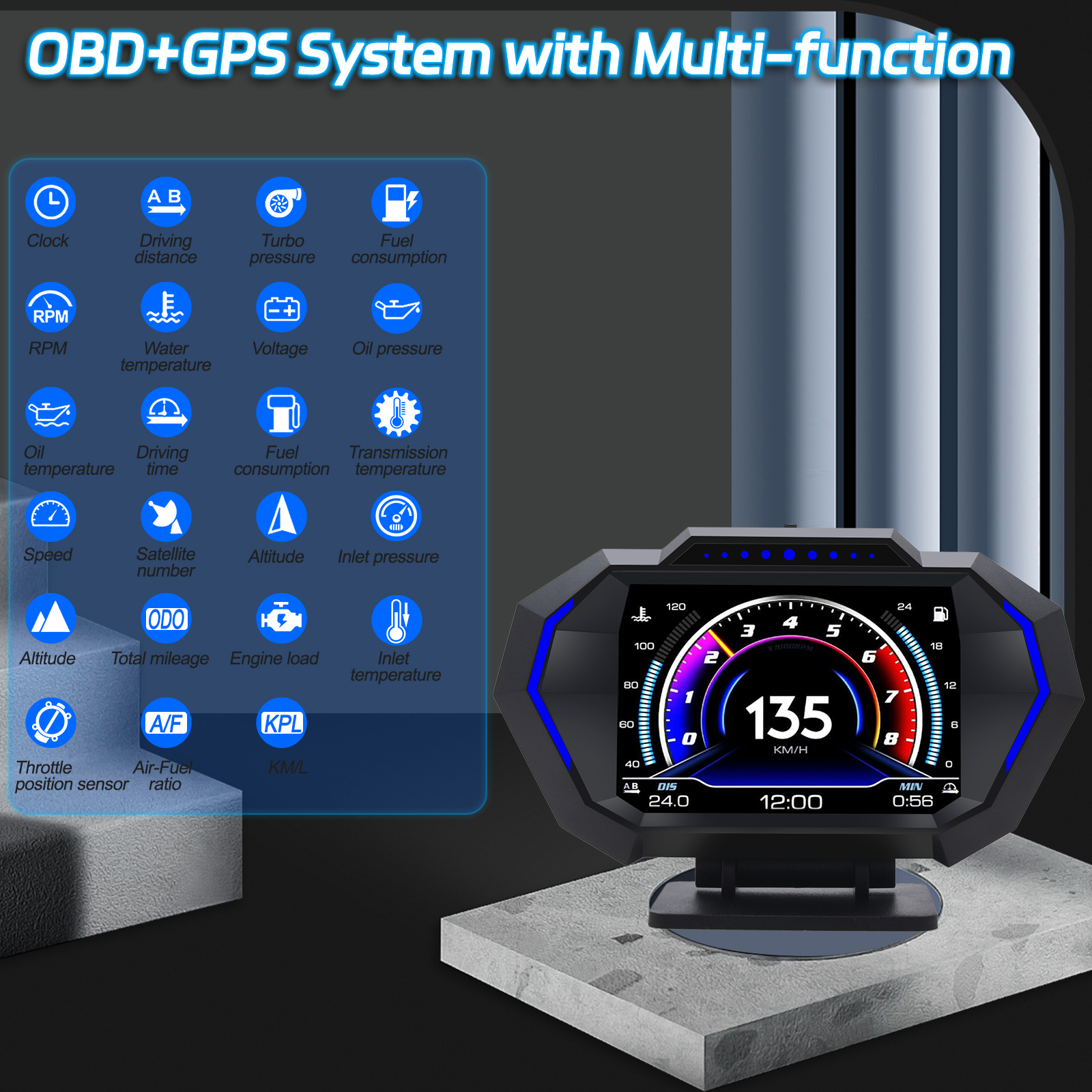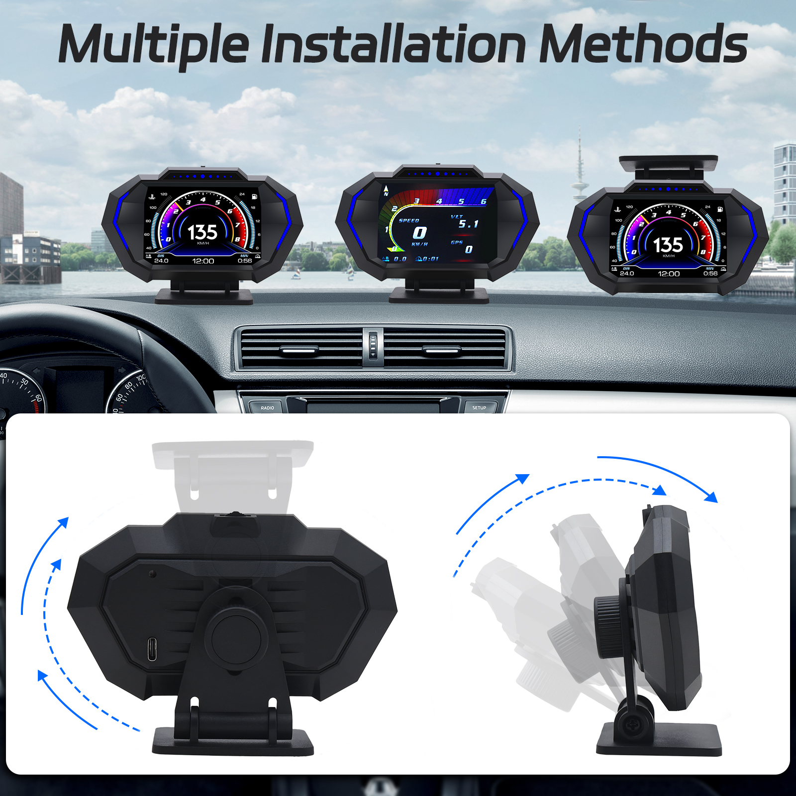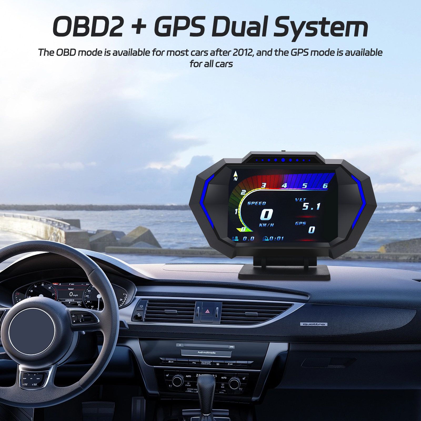 Dieses Head-up-Display verfügt sowohl über einen OBD- als auch einen GPS-Modus. Der OBD-Modus ist mit den meisten Fahrzeugen ab Baujahr 2012 kompatibel, und das GPS-System ist für alle Fahrzeuge geeignet. Es kann je nach Fahrzeugzustand umgeschaltet werden.