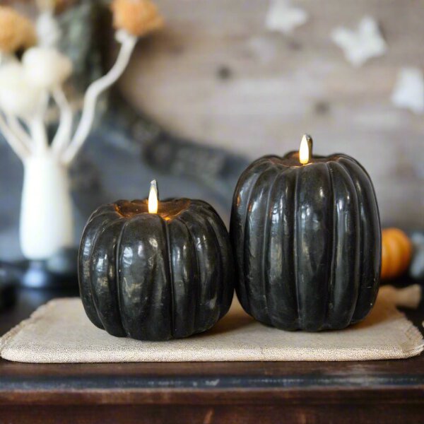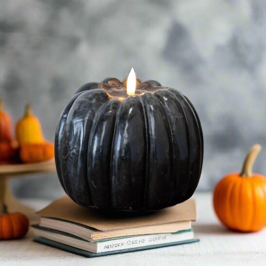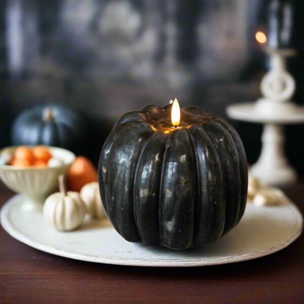 Bring cozy charm to your fall decorations with our 5" Black 3D Pumpkin Candle featuring a lifelike 3D flame.