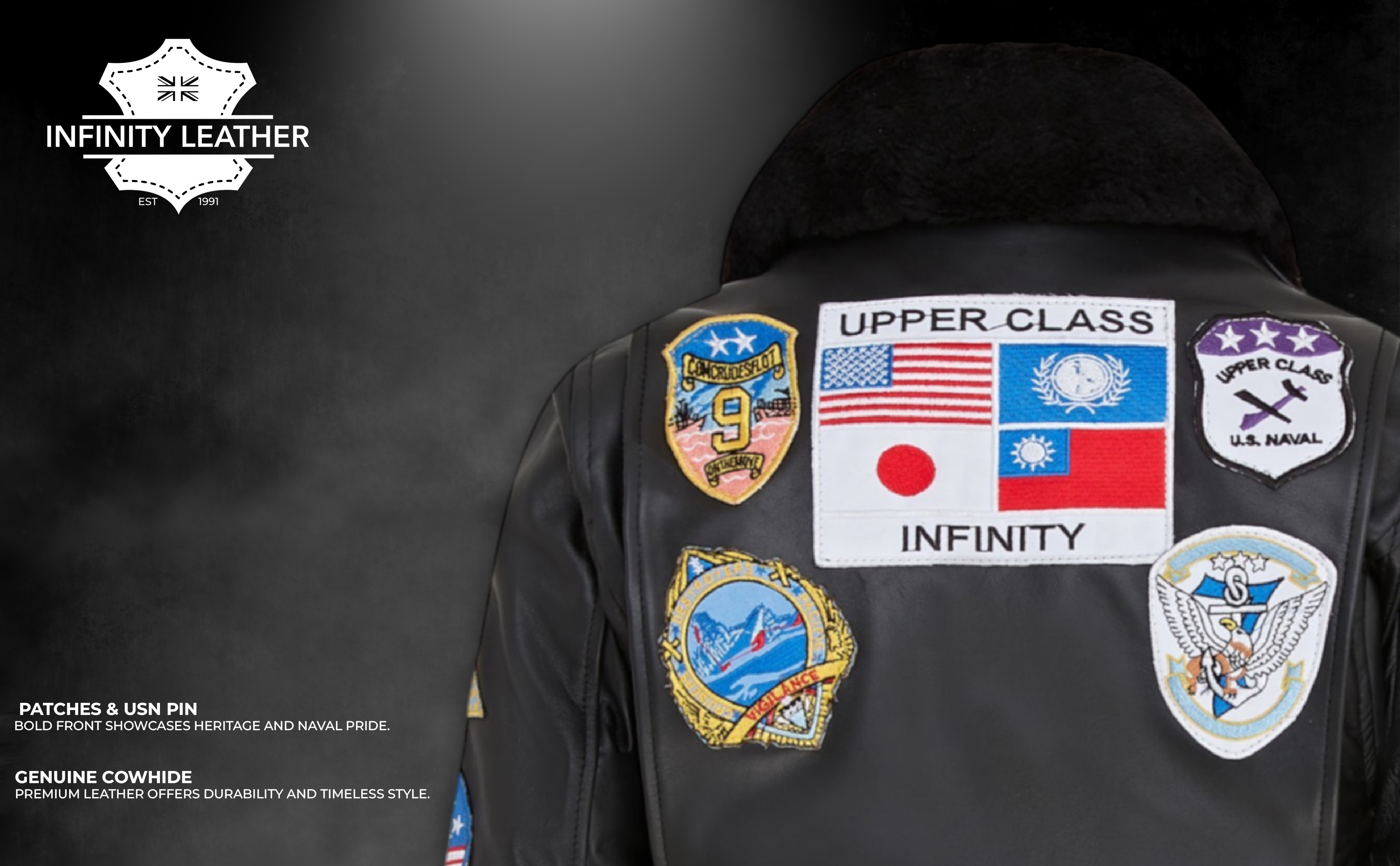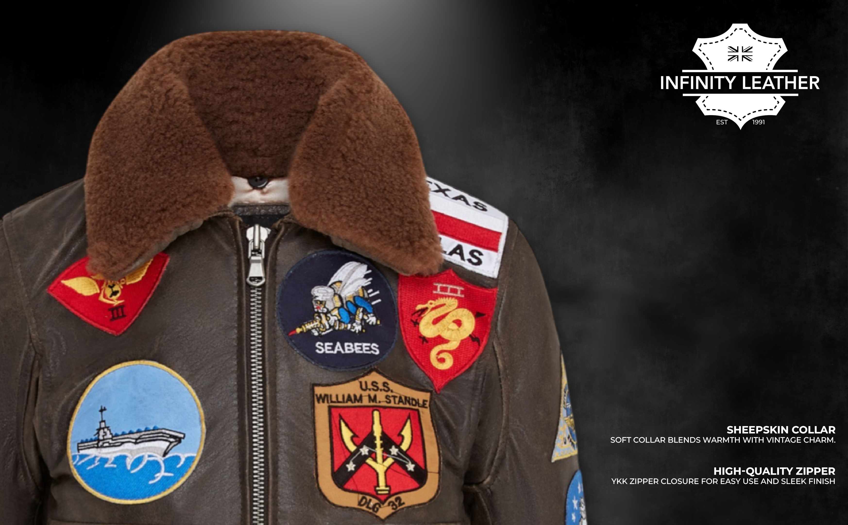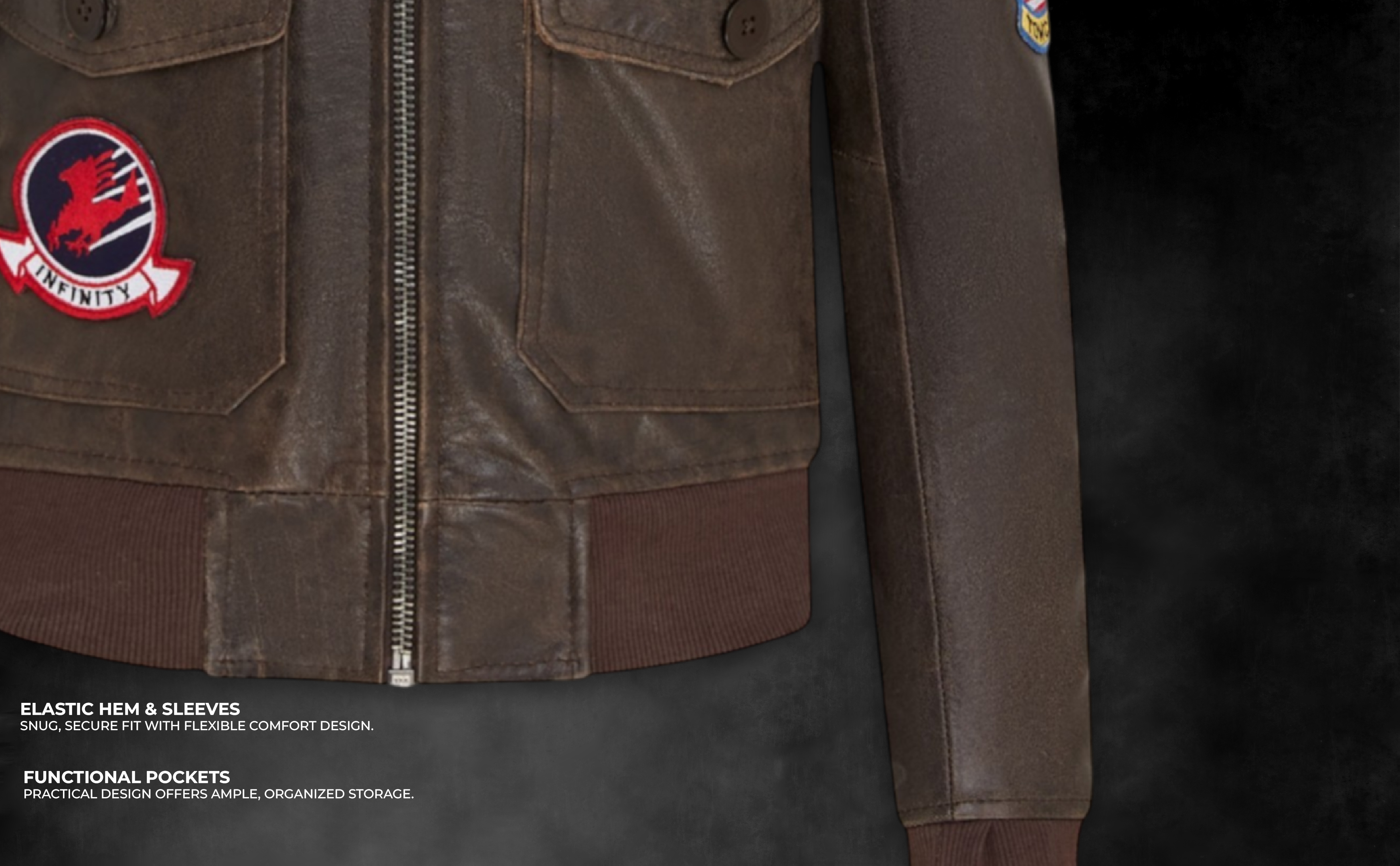 Inspired by the iconic 1986 film, this women's Top Gun flight jacket blends vintage military style with a feminine fit. Crafted from genuine leather and detailed with 17 authentic patches, it's available in two finishes—classic black and aged brown—for a bold, timeless statement.