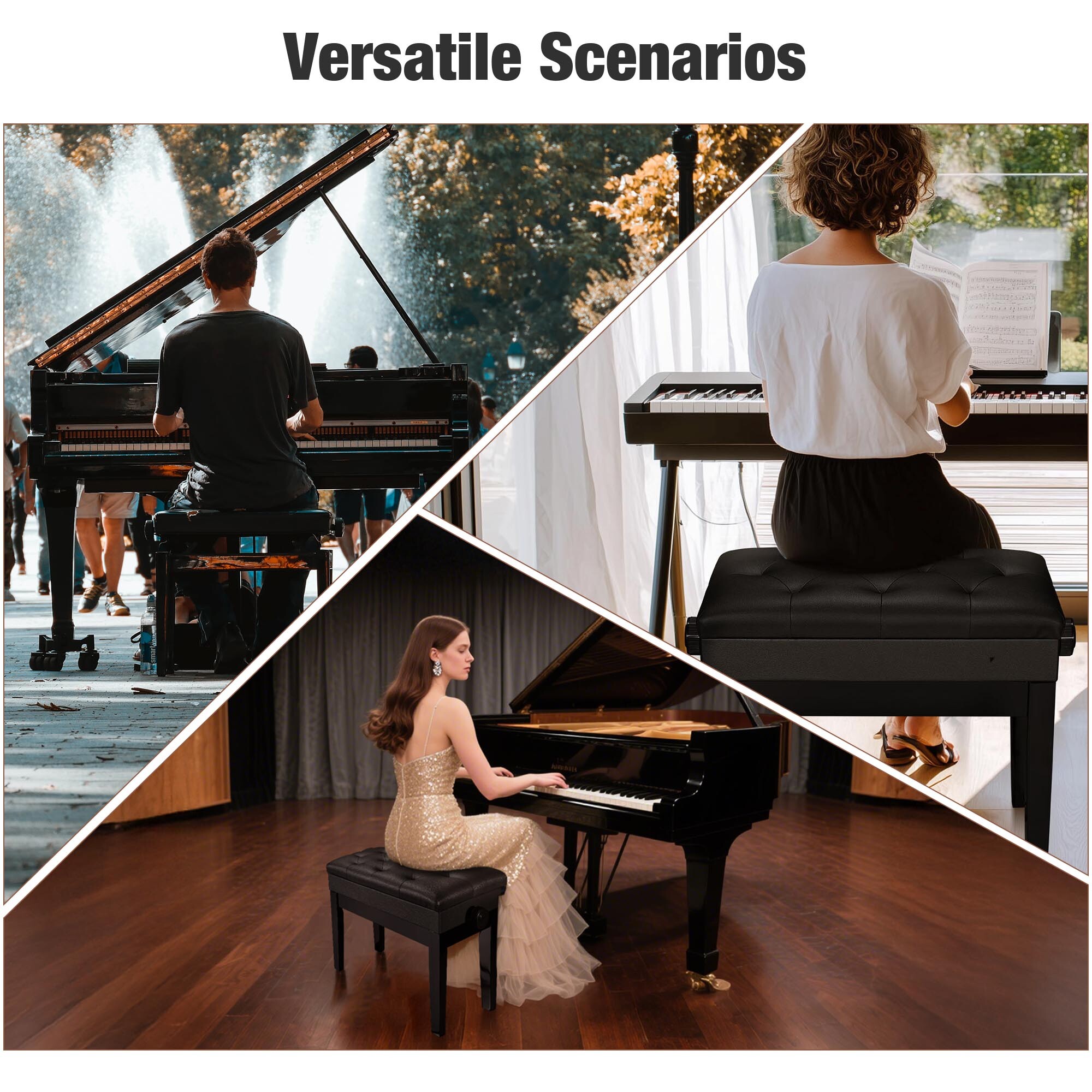 - Comfortable Padded Seat - 22"x13"x19" Concert Piano Bench, made of ergonomic upholstered cushion, help musicians comfortably maintain posture while playing the piano, which is suitable for concerts, recording studio, music bands, orchestras, etc.