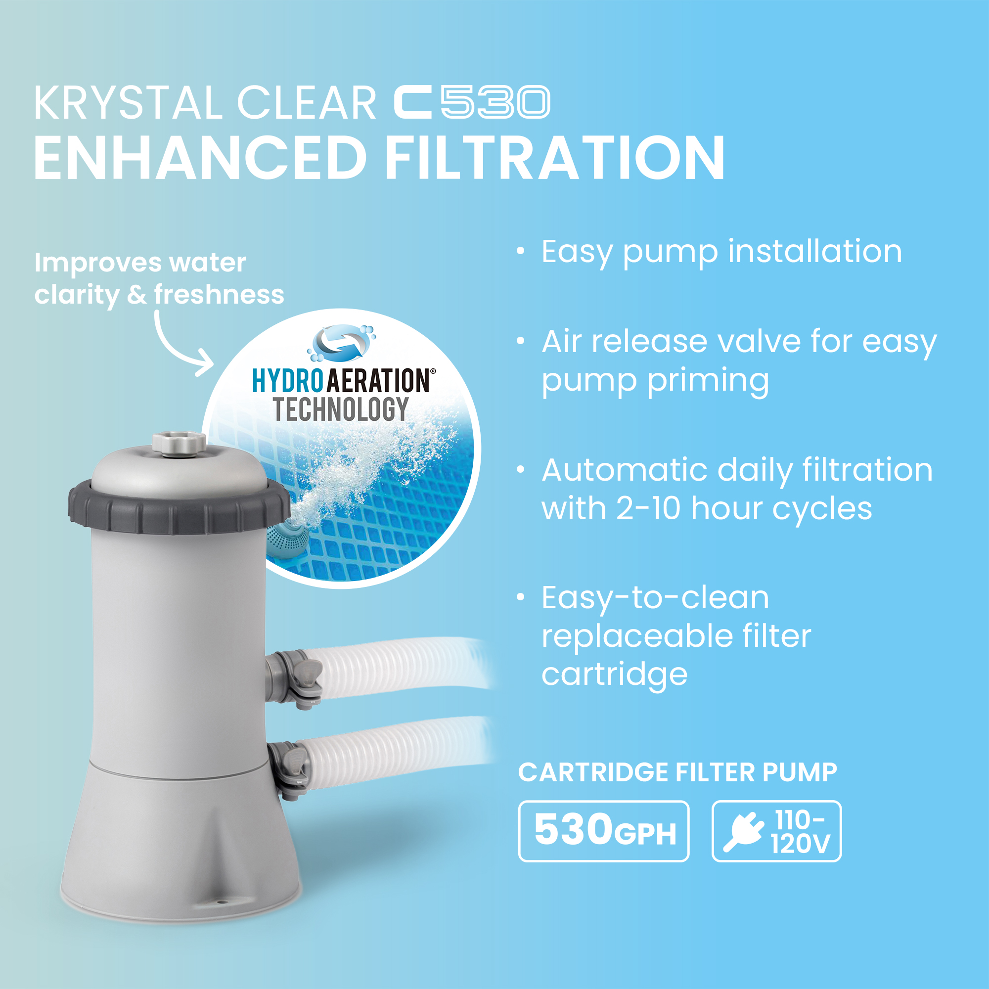 Including an Intex 530 GPH filter pump and a Type "A" filter cartridge, you'll have everything you need to ensure that your pool water stays safe and crystal clear all season long.