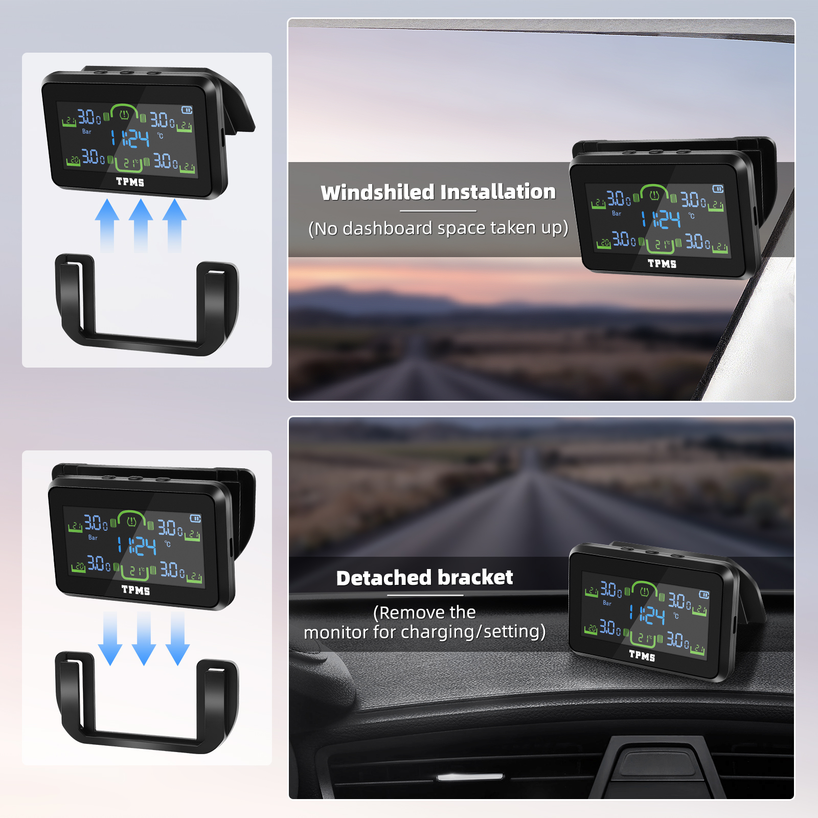 Der 87 mm große LCD-Bildschirm lässt sich mit einer magnetischen 360°-Drehung an der Windschutzscheibe/am Armaturenbrett befestigen. Verfügt über optimierte duale Einheiten (BAR/PSI &°C/°F) und einen automatisch abdunkelnden Nachtmodus.