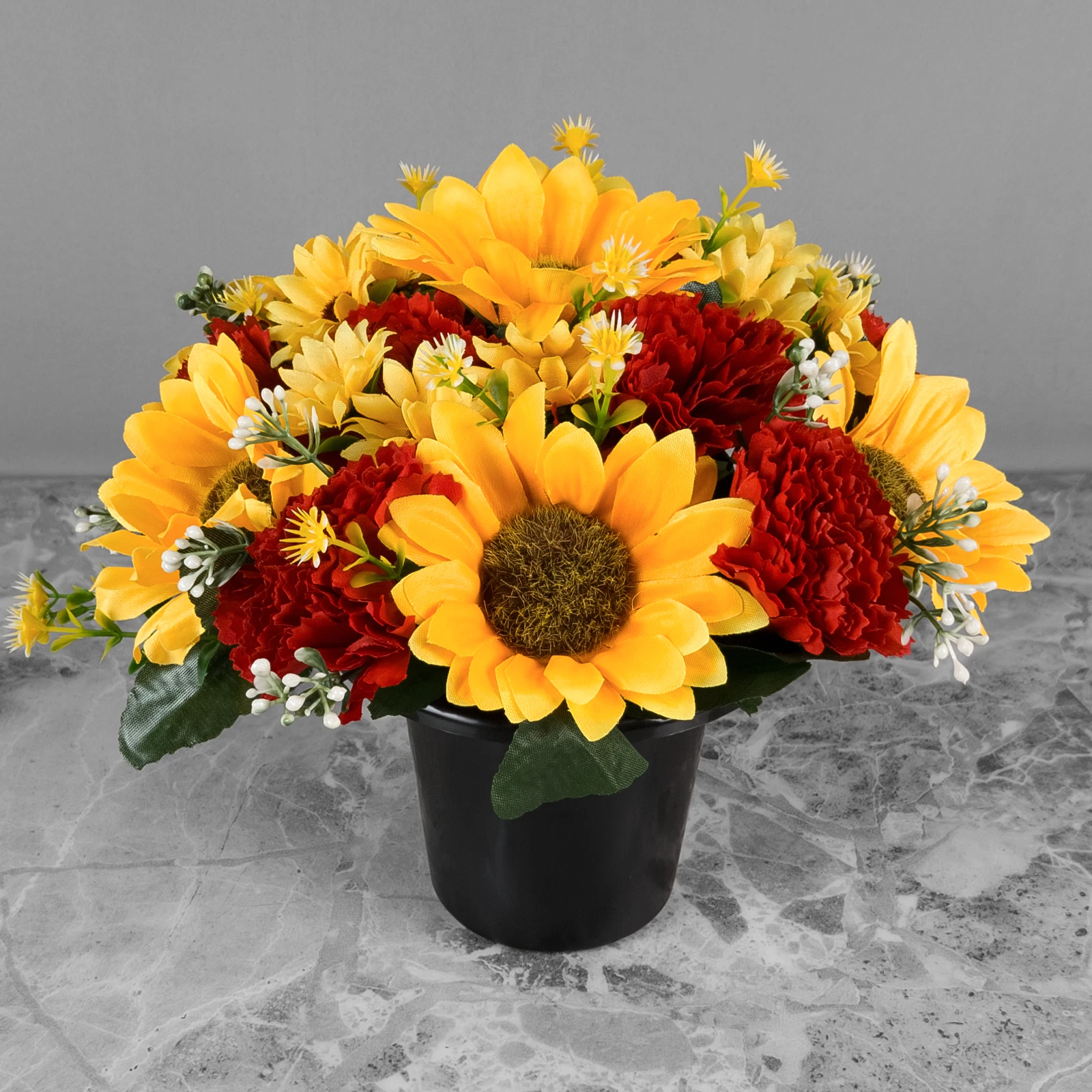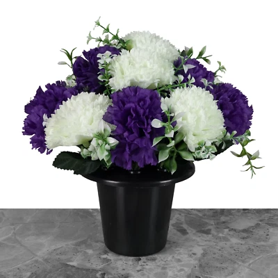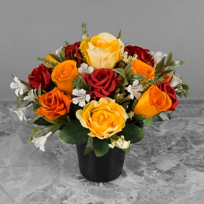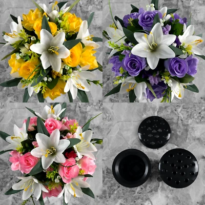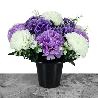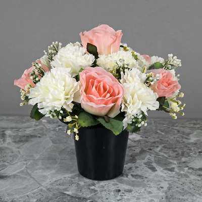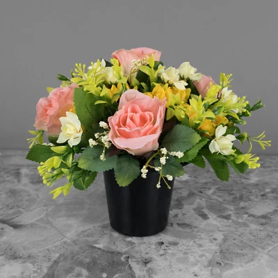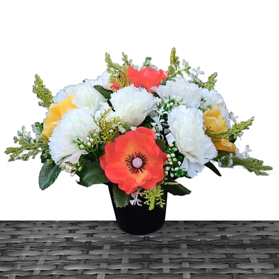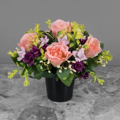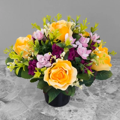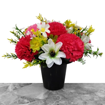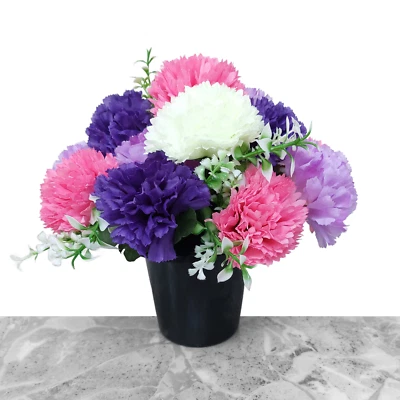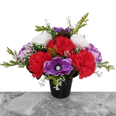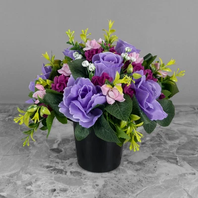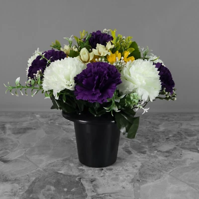 A perfectly balanced, hand-arranged selection of artificial flowers in a black, plastic, grave pot.