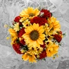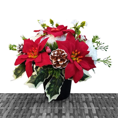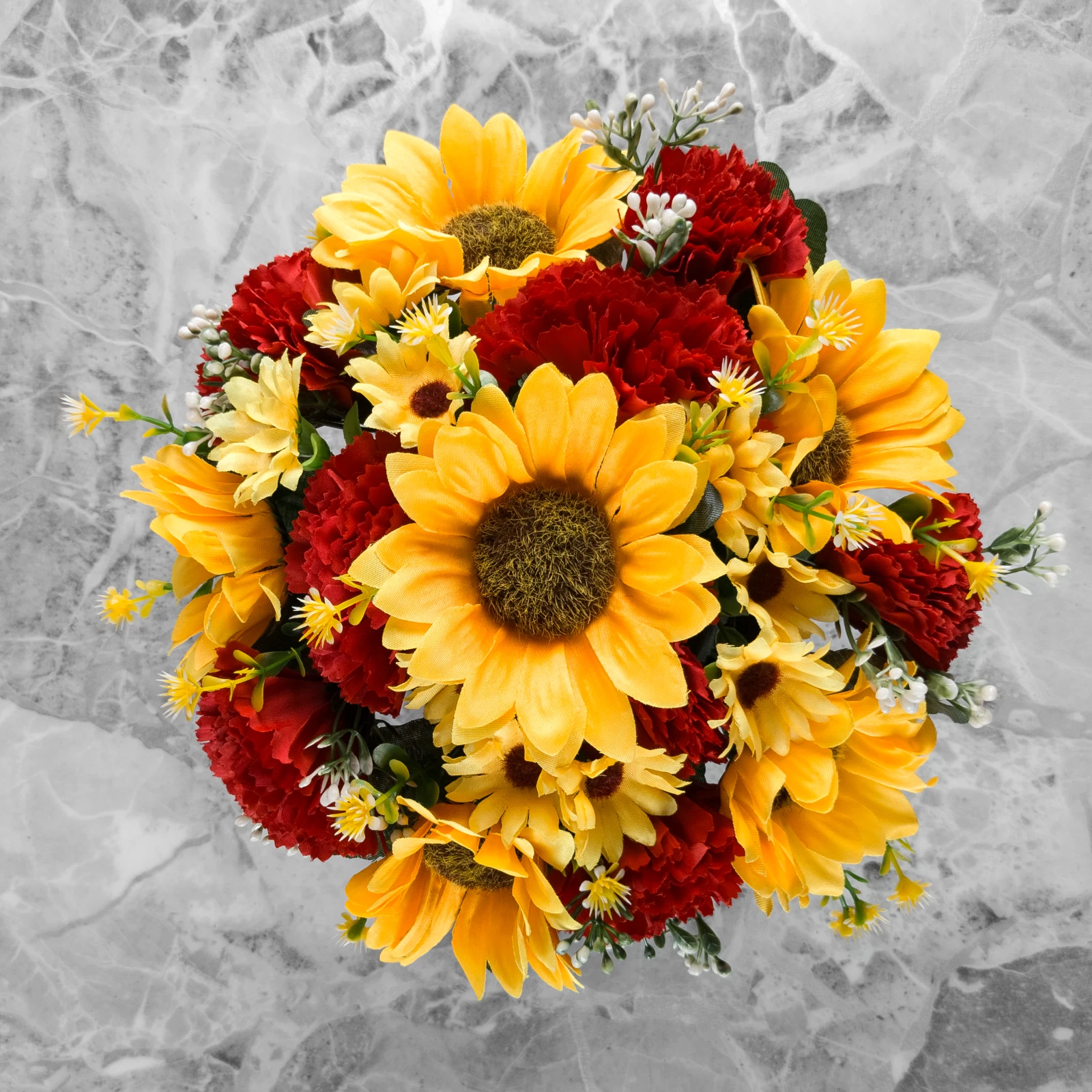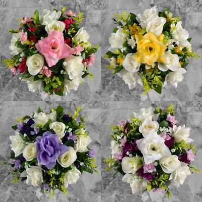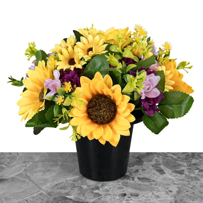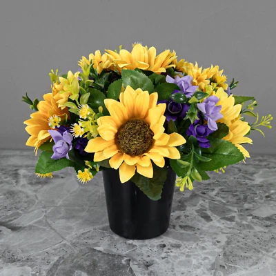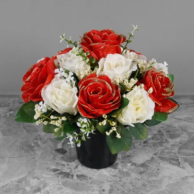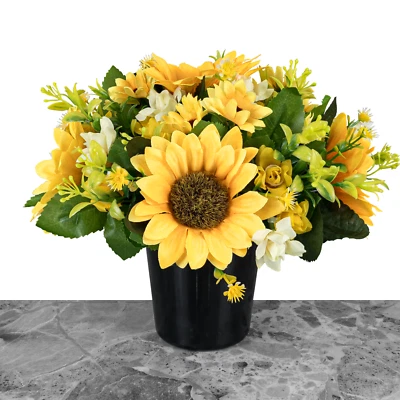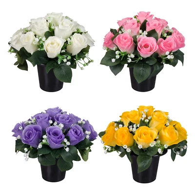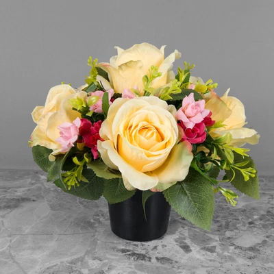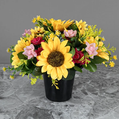 A perfectly balanced, hand-arranged selection of artificial flowers in a black, plastic, grave pot.