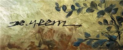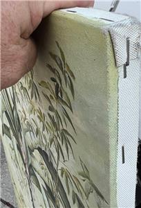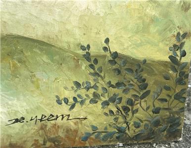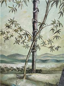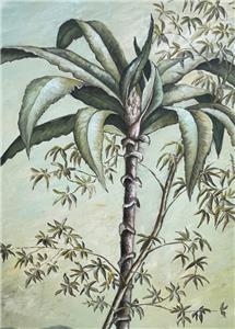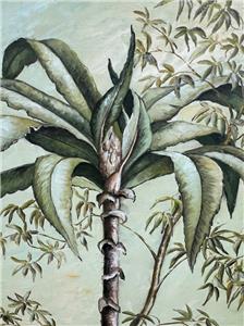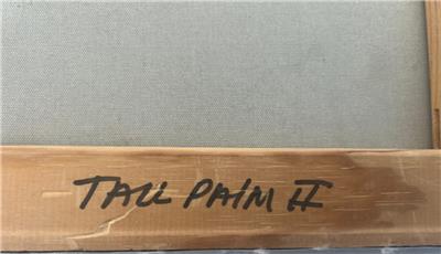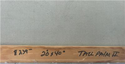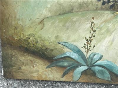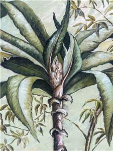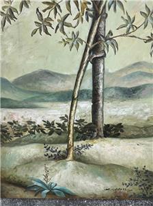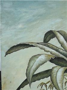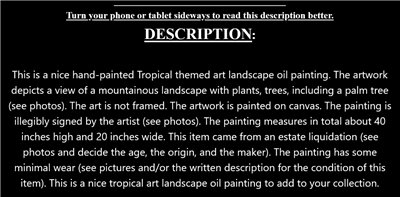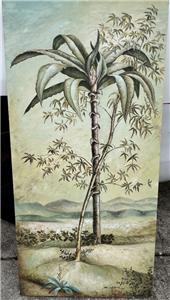 This is a nice hand-painted Tropical themed art landscape oil painting. The artwork depicts a view of a mountainous landscape with plants, trees, including a palm tree (see photos). The art is not framed. The artwork is painted on canvas. The painting is illegibly signed by the artist (see photos). The painting measures in total about 40 inches high and 20 inches wide. This item came from an estate liquidation (see photos and decide the age, the origin, and the maker). The painting has some minimal wear (see pictures and/or the written description for the condition of this item). This is a nice tropical art landscape oil painting to add to your collection.