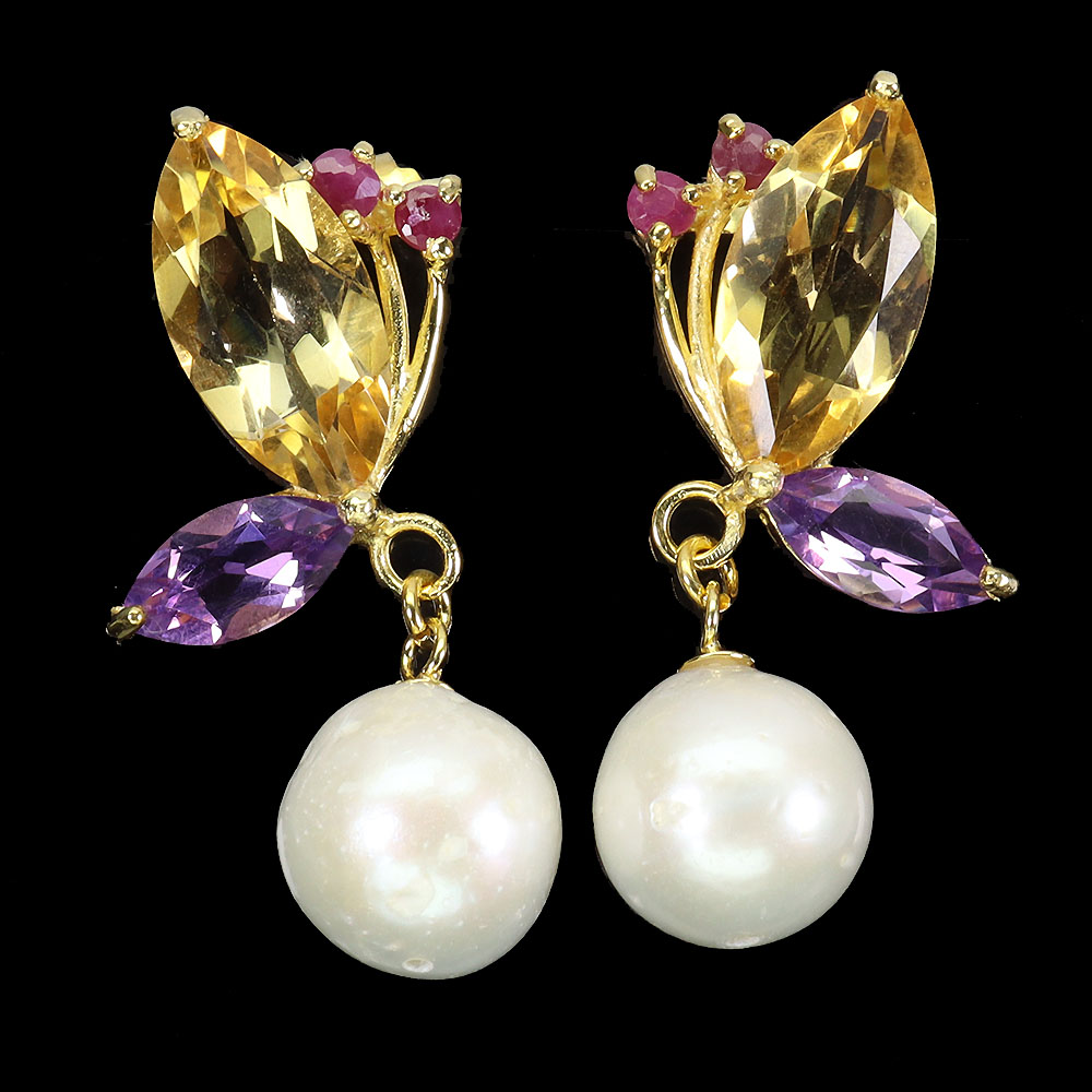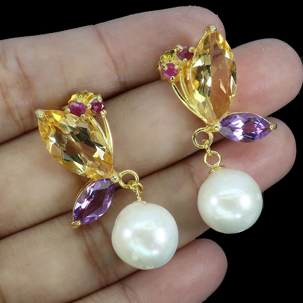 925 Sterling Silver Earrings Marquise Citrine Amethyst Pearl Gemstone Jewelry