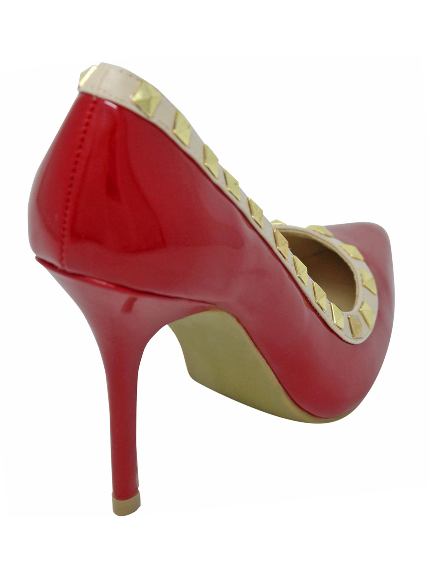 Gold tone pyramid studs trim the edge of these classic stiletto pumps for women.