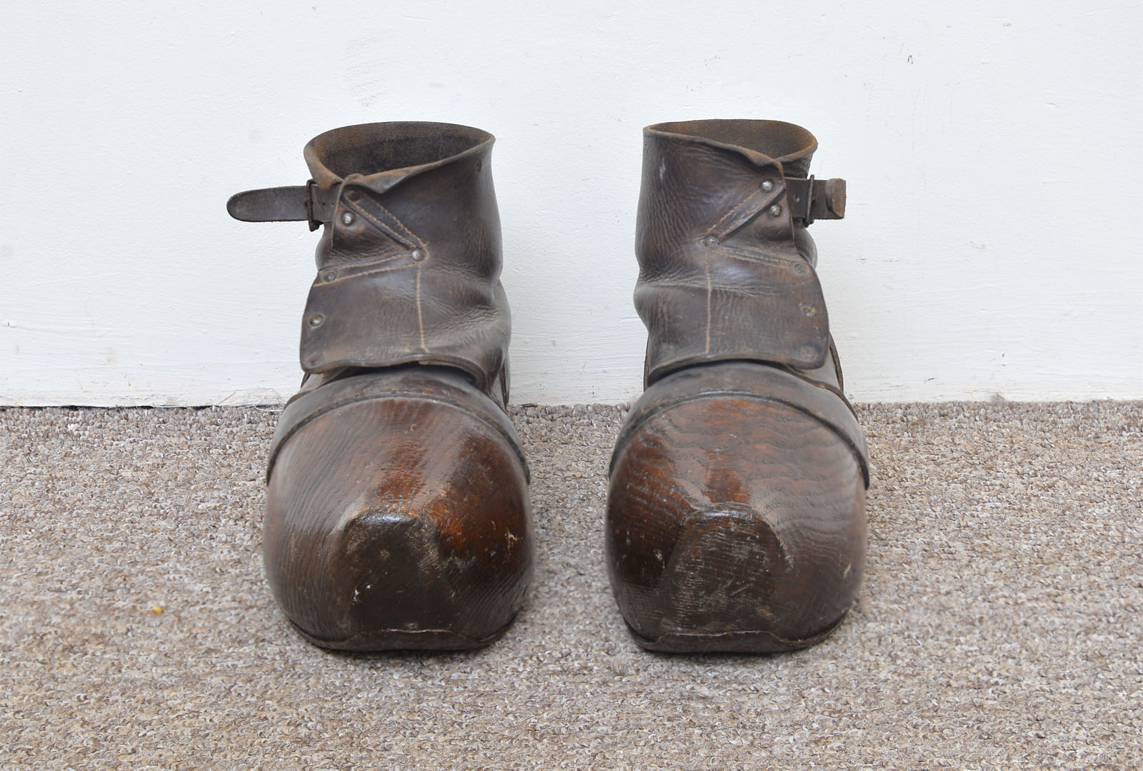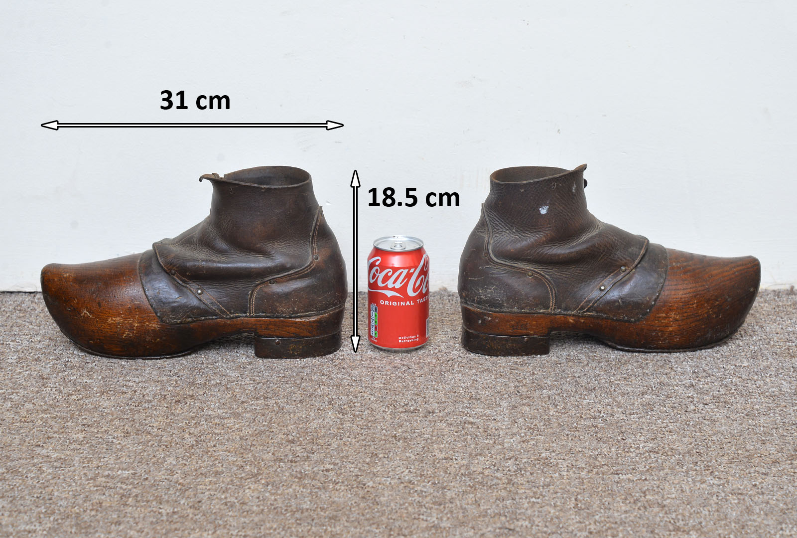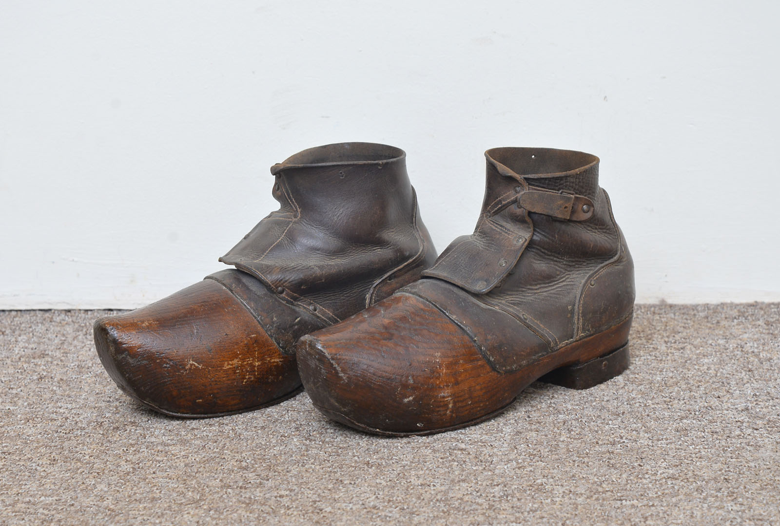 Believed to be known as farm worker or garden clogs, they have wooden soles and leather uppers with metal “horse shoe style” reinforcement to the underside meaning they have lasted until present day.