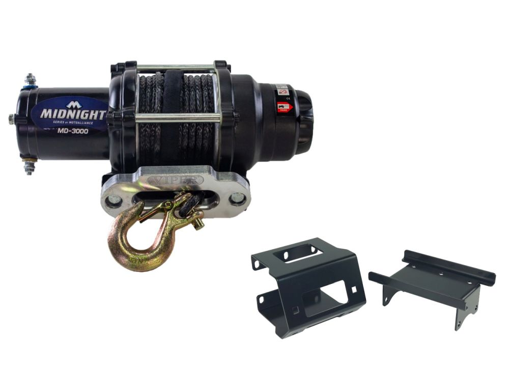 The VIPER Midnight 3,000lb Winch is a durable winch for ATVs, UTVs and Side by Sides. A great winch for snowplowing and mudding with ATV and UTVs, it has a sealed planetary metal gear train, a 1.1 horsepower permanent magnet motor, automatic brake, and stainless-steel hardware. Waterproof handle bar switch and synthetic rope are standard on this Midnight winch.