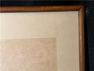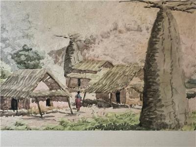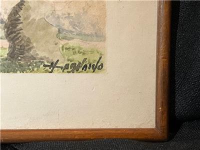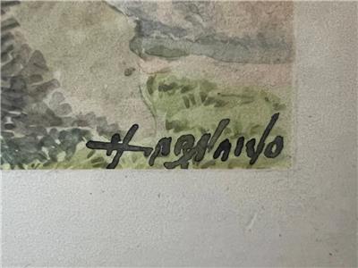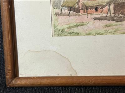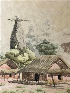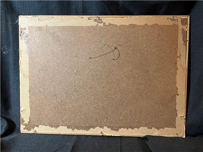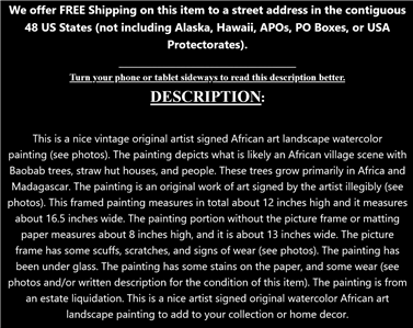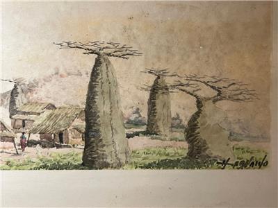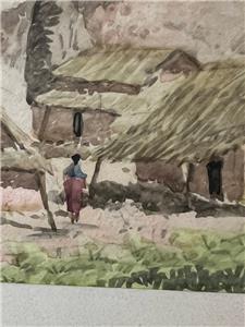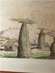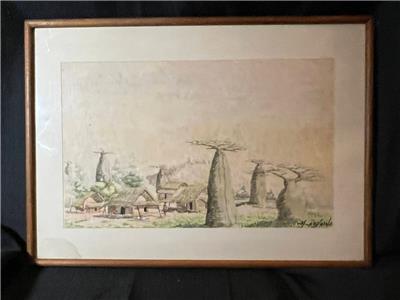 This is a nice vintage original artist signed African art landscape watercolor painting (see photos). The painting depicts what is likely an African village scene with Baobab trees, straw hut houses, and people. These trees grow primarily in Africa and Madagascar. The painting is an original work of art signed by the artist illegibly (see photos). This framed painting measures in total about 12 inches high and it measures about 16.5 inches wide. The painting portion without the picture frame or matting paper measures about 8 inches high, and it is about 13 inches wide. The picture frame has some scuffs, scratches, and signs of wear (see photos). The painting has been under glass. The painting has some stains on the paper, and some wear (see photos and/or written description for the condition of this item). The painting is from an estate liquidation. This is a nice artist signed original watercolor African art landscape painting to add to your collection or home decor.