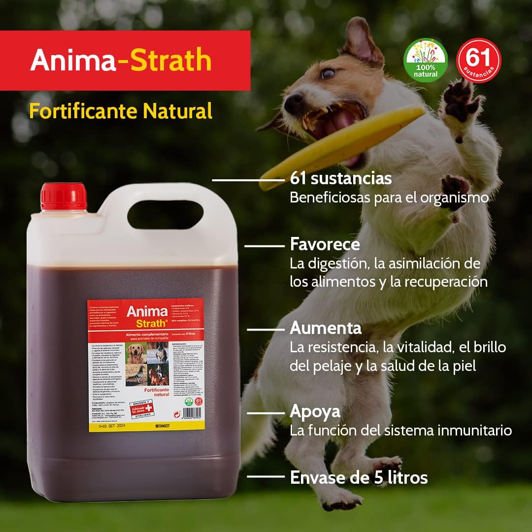 Suplemento alimenticio 100% natural a base de levadura de cerveza y una selección de plantas.Energía y vitalidad.Estimula el apetito.Pelo sano y brillanteAumenta las defensas naturales.ANIMA STRATH es un alimento complementario 100% natural para todas las especies animales. Las células de levadura contienen una importante cantidad de nutrientes que se liberan por un proceso de plasmólisis, favoreciendo que las sustancias naturales puedan ser absorbidas por los organismos animales.Además de proteínas, lípidos e hidratos de carbono, ANIMA STRATH contiene todos los aminoácidos esenciales, numerosas vitaminas del grupo B, sustancias minerales, oligoelementos y enzimas.De los elementos constituyentes destacamos:Los ácidos nucleicos vegetales, ADN y ARN, responsables de numerosos procesos de origen enzimático y de biosíntesis de las proteínas.Los glucanos, mananos y selenio, por su acción de refuerzo de las defensas inmunitarias, protegiendo contra las infecciones bacterianas y virales.Las vitaminas del grupo B, para luchar contra el estrés, la fatiga y fortalecer el sistema nervioso.La L-carnitina, reconstituyente muscular, y el ATP, vector energético muscular esencial para el organismo.No contiene ninguna sustancia artificial, aditivos sintéticos, colorantes o conservantes.Indicaciones:Aumenta la resistencia y la vitalidad.Potencia las defensas naturales, estimula y vigoriza el sistema inmunitario.Mejora el apetito y favorece la digestión y asimilación de los alimentos.Favorece la recuperación en estados de convalecencia.Aumenta el brillo del pelaje y la salud de la piel.Coadyuvante en tratamientos de la piel.Aumenta el rendimiento y ayuda a superar el estrés.Coadyuvante terapéutico en afecciones hepáticas y pancreáticas.Favorece la reproducción.Suplemento de alto valor en estados de gravidez y lactancia.Administración y dosis: |