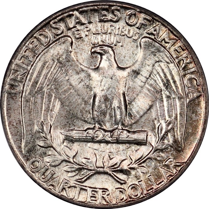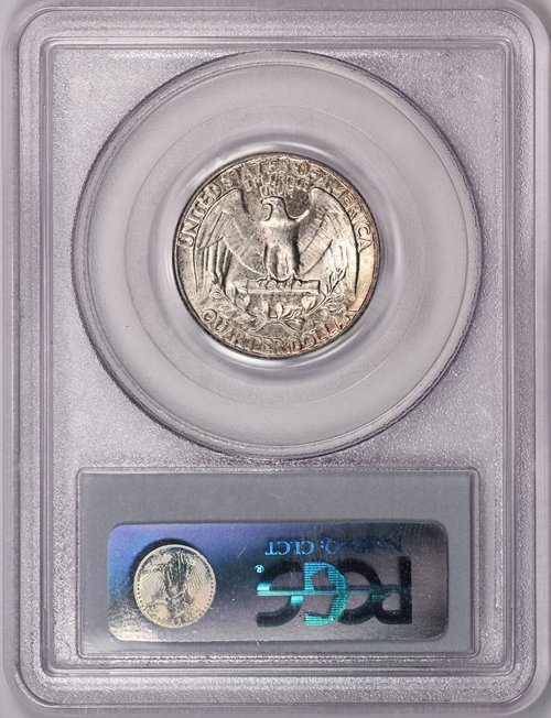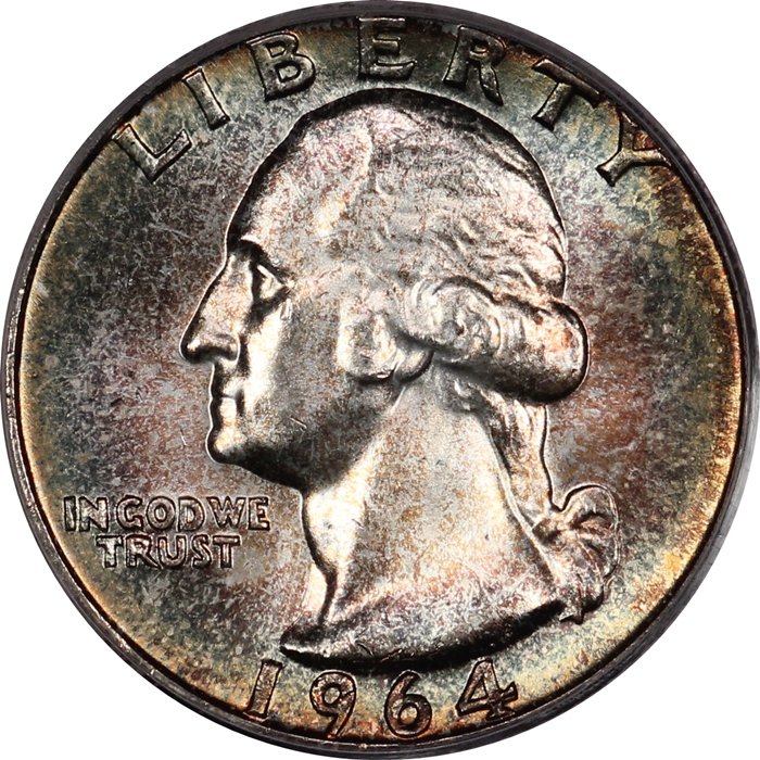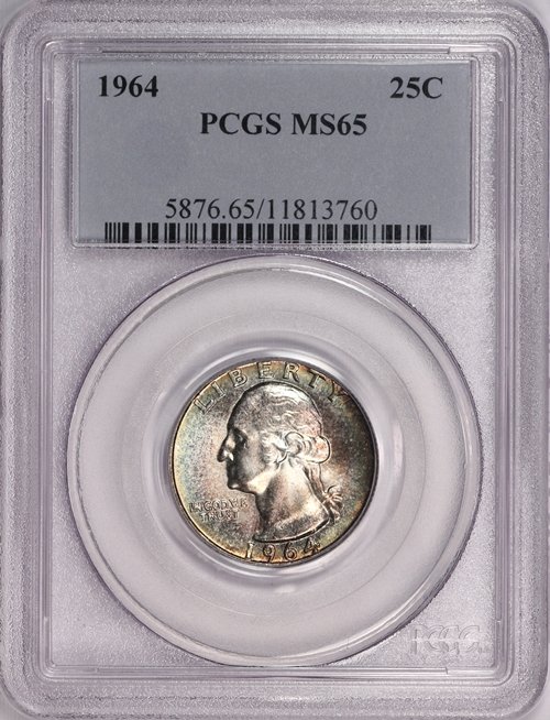 A gorgeous rainbow toned Gem BU PCGS MS65 1964 Washington Quarter with full cartwheel luster, original skin, and colorful toning as shown in the photos above. Surface preservation appears very nice for the assigned grade, with miniscule surface chatter. Housed in an early generation PCGS Blue Holder.
