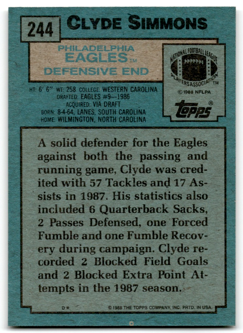 | 1988 Topps Clyde Simmons Rookie Philadelphia Eagles #244 |