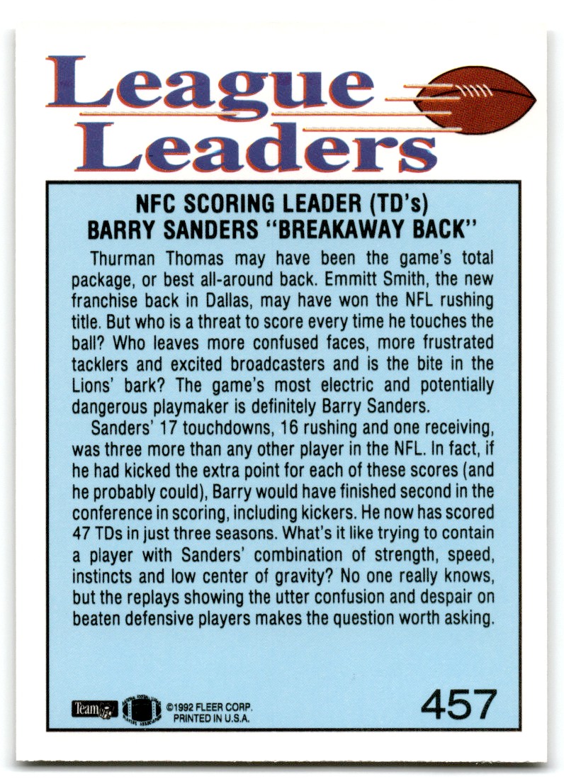| 1992 Fleer Barry Sanders Detroit Lions #457 |