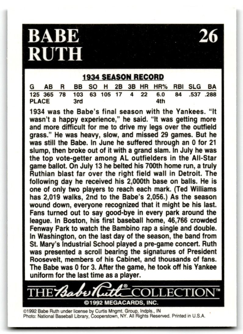 | 1992 Megacards Babe Ruth Babe Ruth New York Yankees #26 |