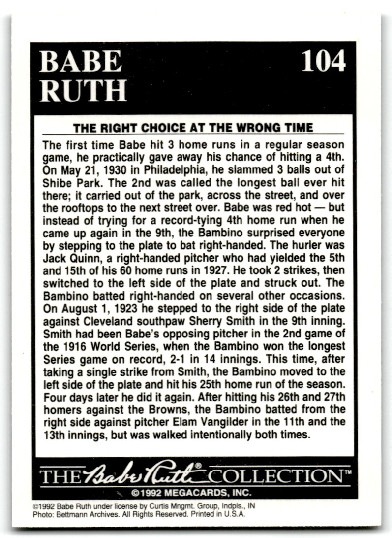 | 1992 Megacards Babe Ruth Babe Bats Righty New York Yankees #104 |