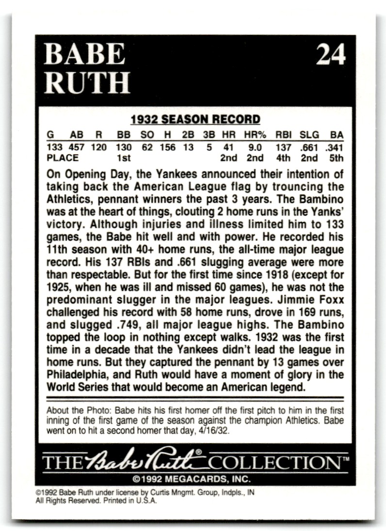 | 1992 Megacards Babe Ruth Babe Ruth New York Yankees #24 |