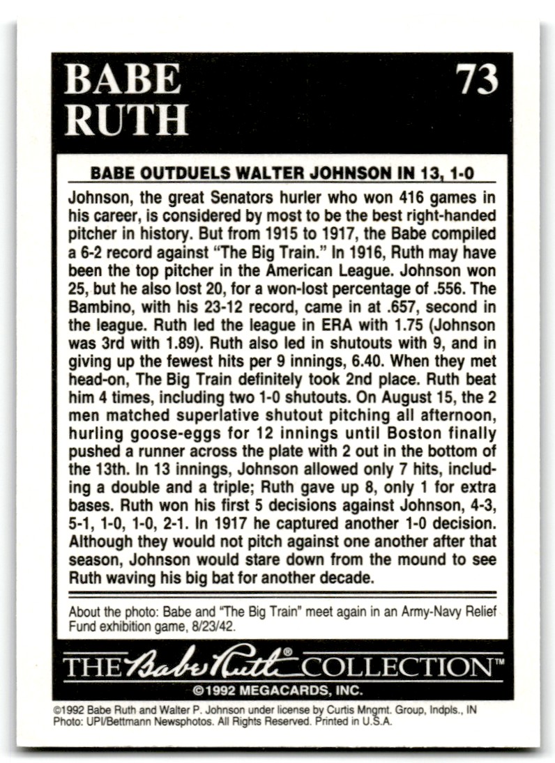 | 1992 Megacards Babe Ruth Babe Derails Big Train New York Yankees #73 |