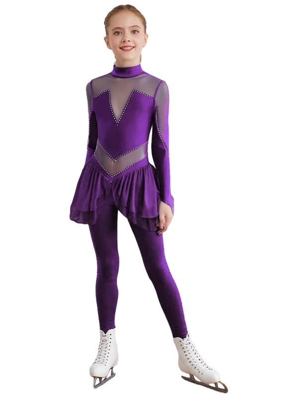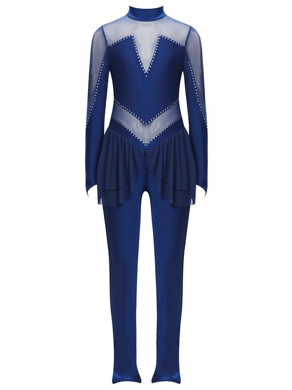 Figure skating jumpsuit offer a sleek and streamlined look, with an elastic band at the leg openings for a secure fit and ease of movement.